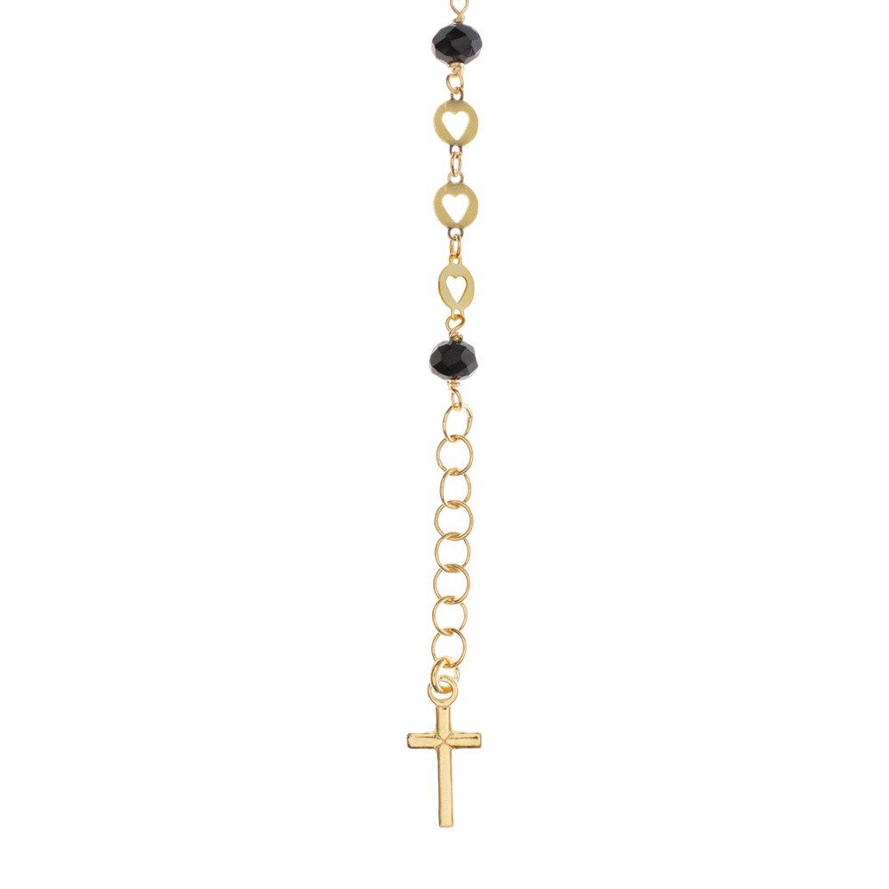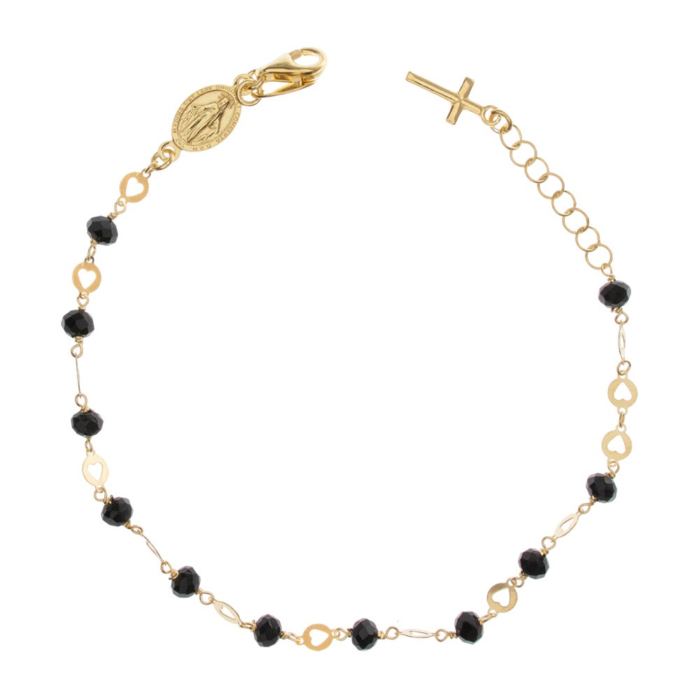 This bracelet is made up of round grains in black faceted crystal (Ø 0.3 cm), a golden medal of Our Lady Of Miracles and a cross pendant.