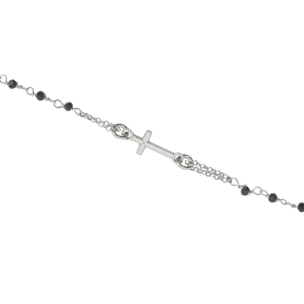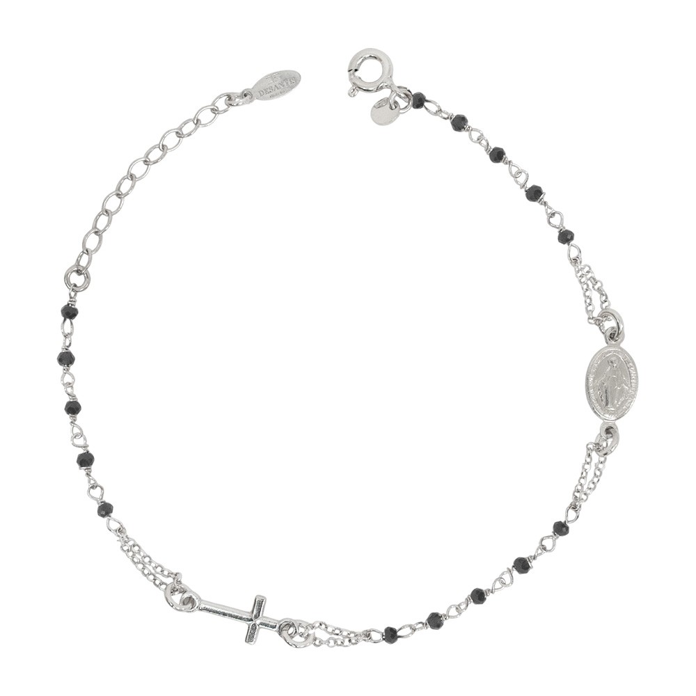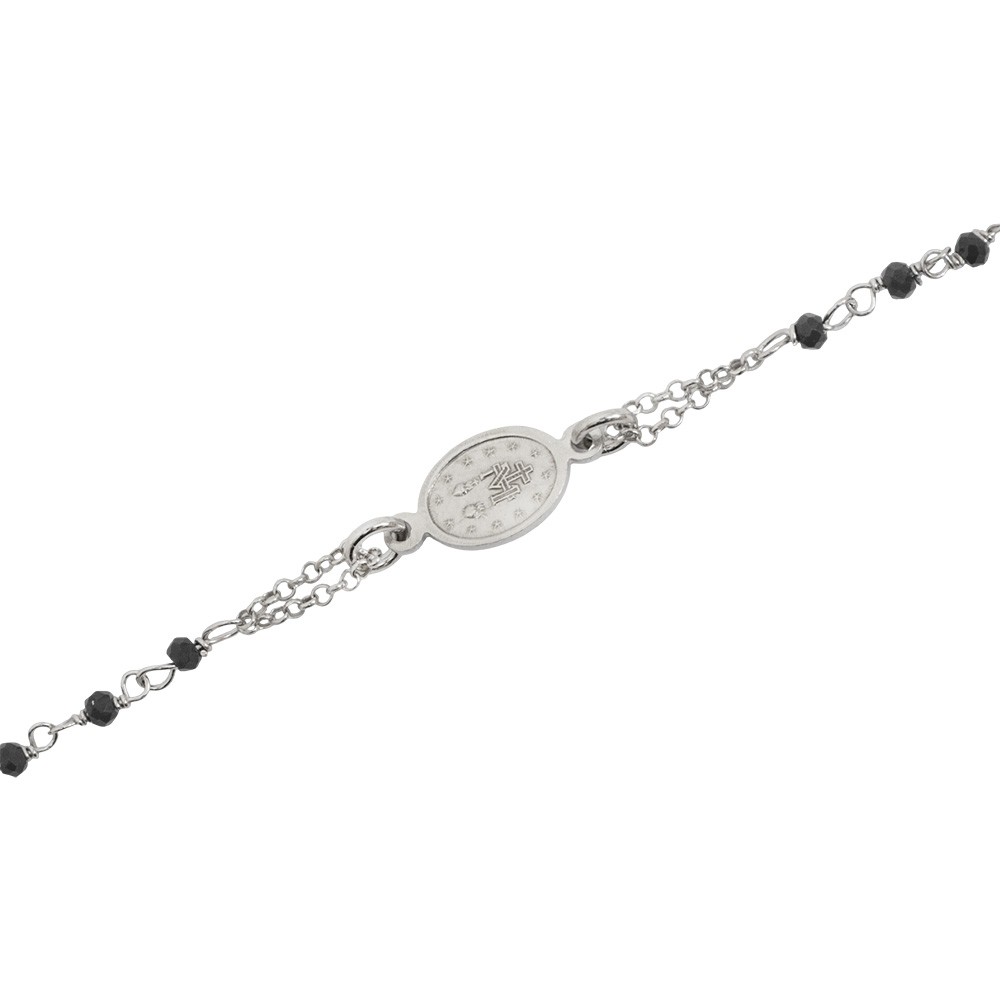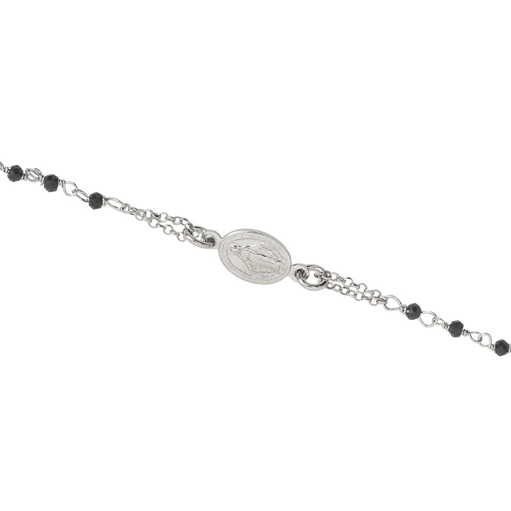 Rosary bracelet in 925 silver with silver finish, featuring black crystal beads, a cross, and the Miraculous Medal, adding a refined and spiritual touch.