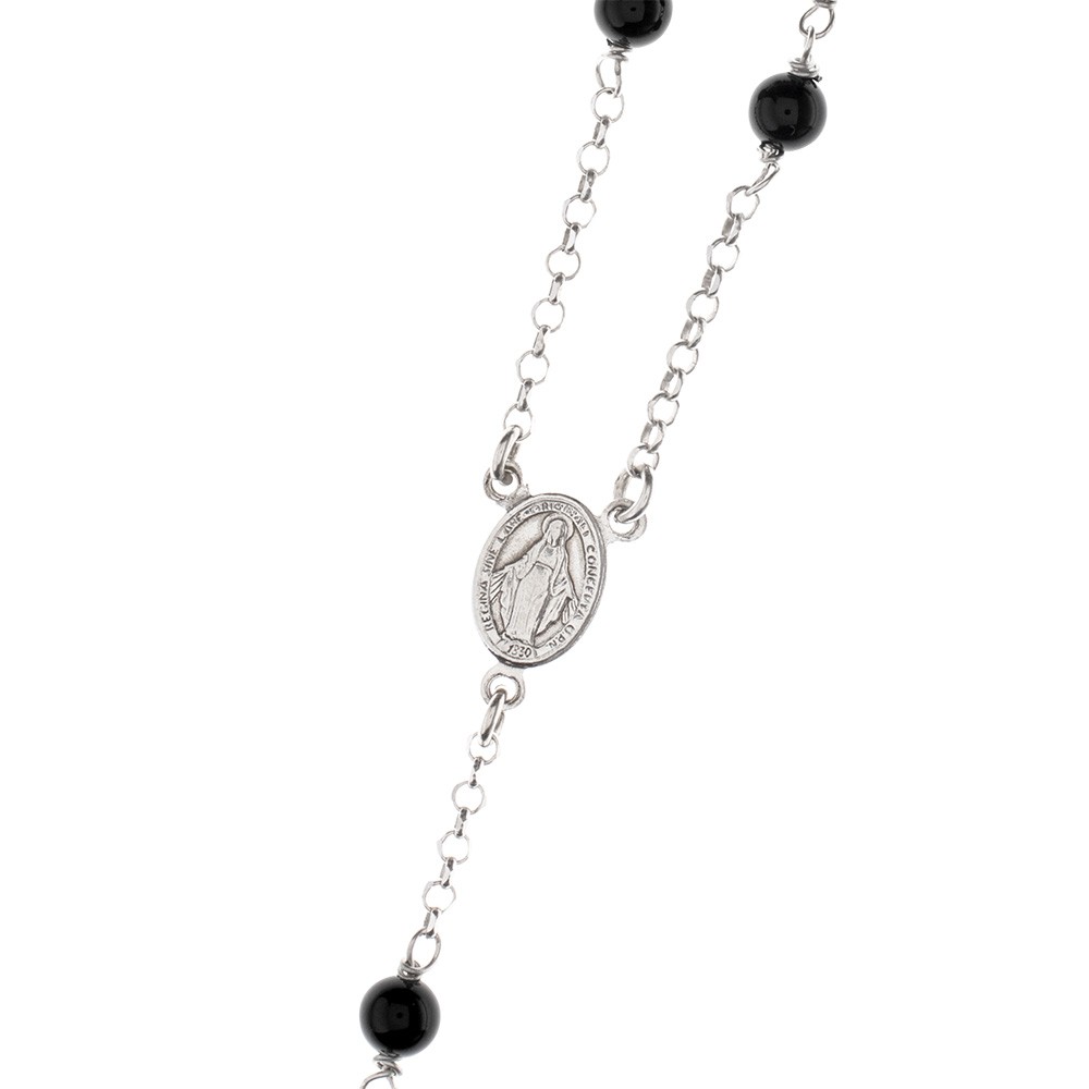 An elegant Italian-made rosary necklace, featuring a crucifix and Miraculous Medal, designed for daily wear and as a meaningful Catholic gift idea.