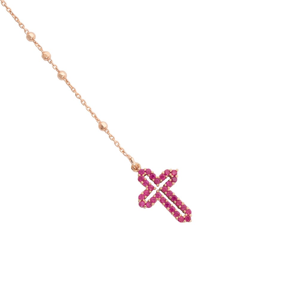 Woman rosary in rose-plated 925 silver with Sacred Heart and cross-shaped pendant, enriched with ruby-colored zirconias.