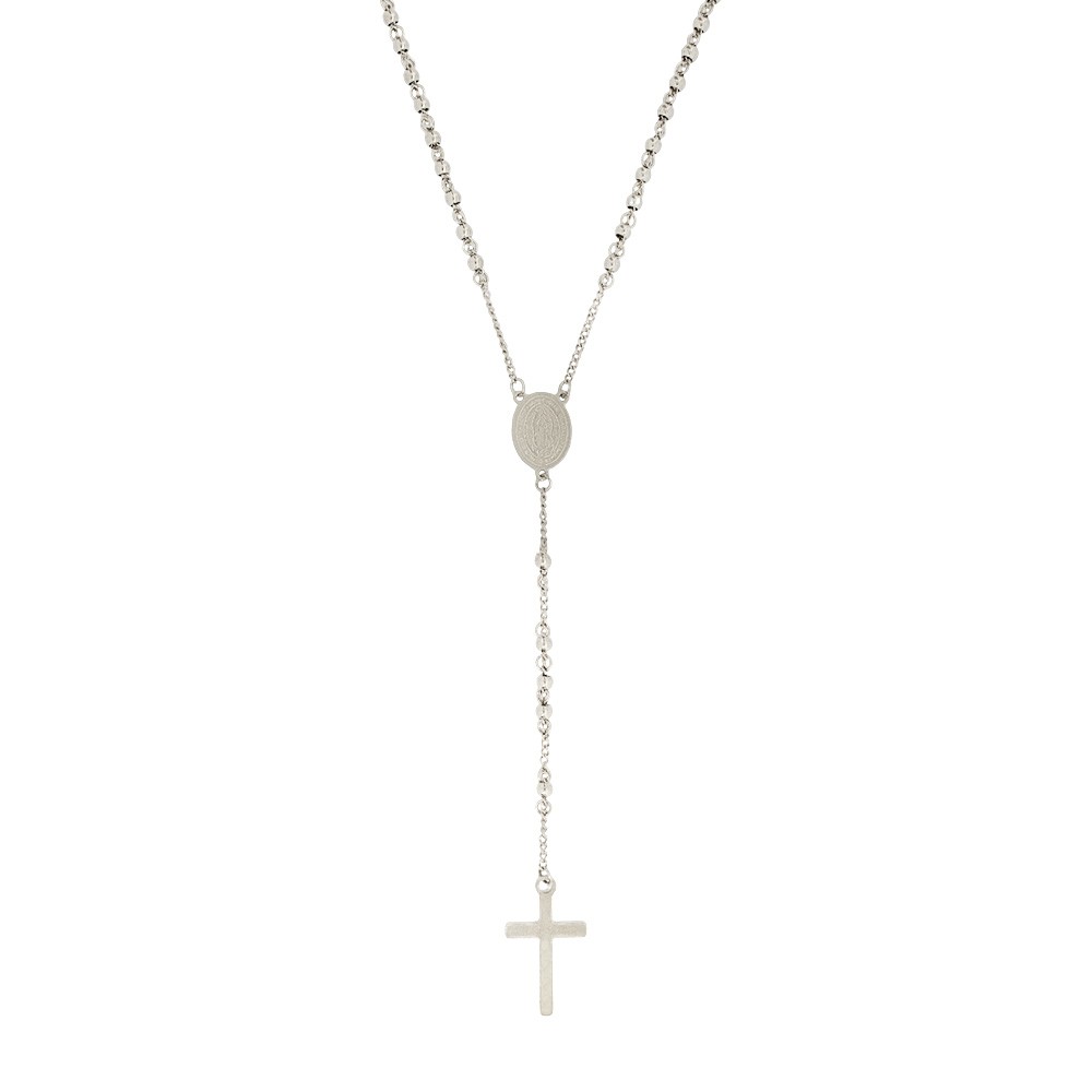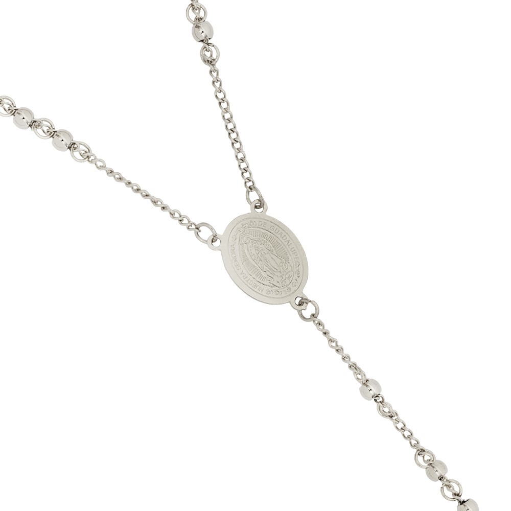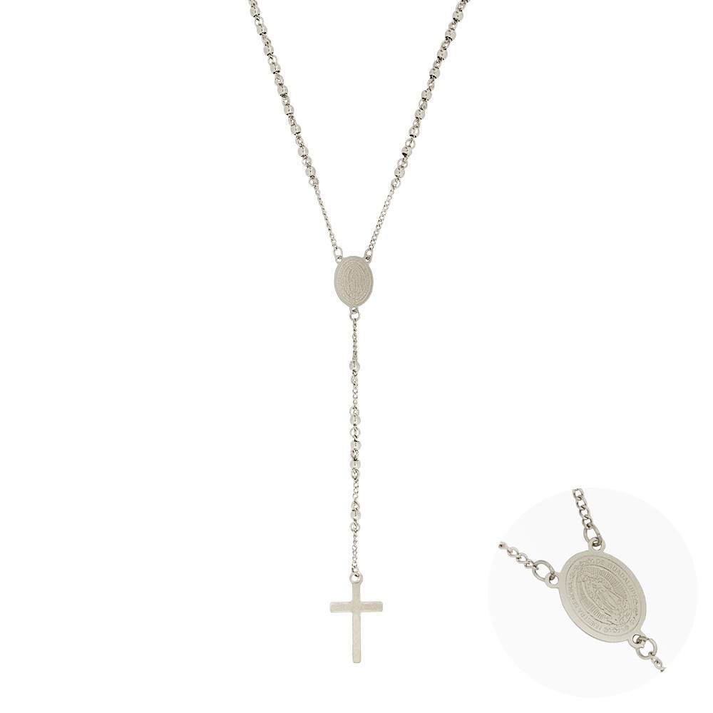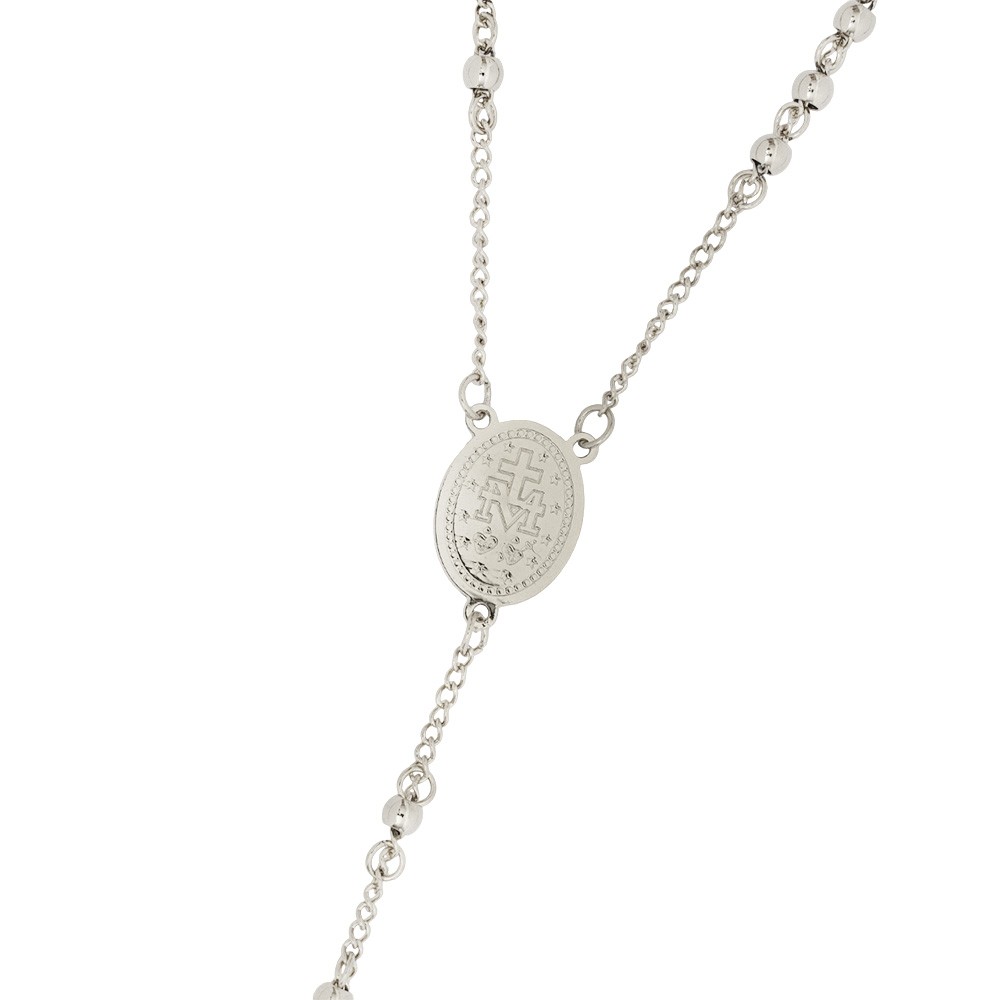 Rosary necklace made of silver-plated steel with round beads (Ø 3 mm), oval medal of Our Lady Of Miracles (h 1.8 cm) and cross.