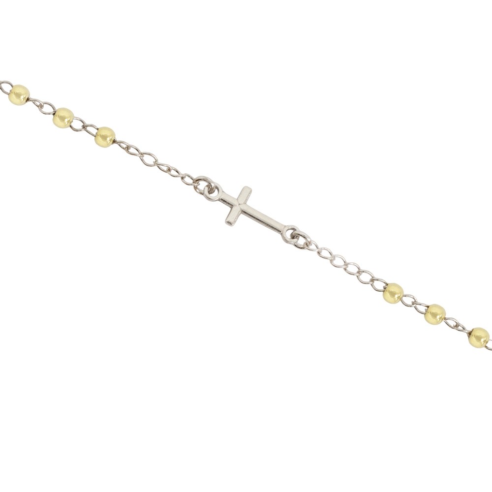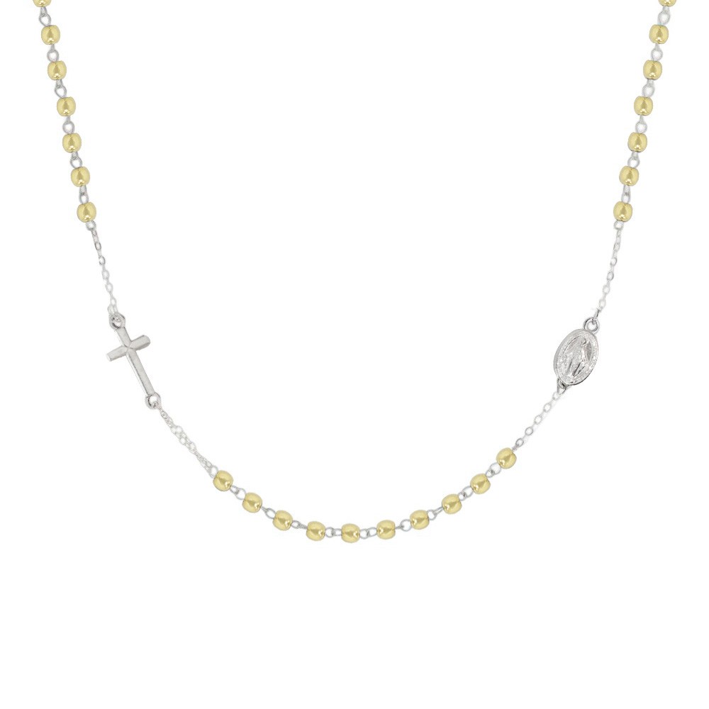 This elegant rosary necklace is designed to be worn as a choker, crafted from fine 925 sterling silver with gold-tone beads that create a refined chromatic contrast.
