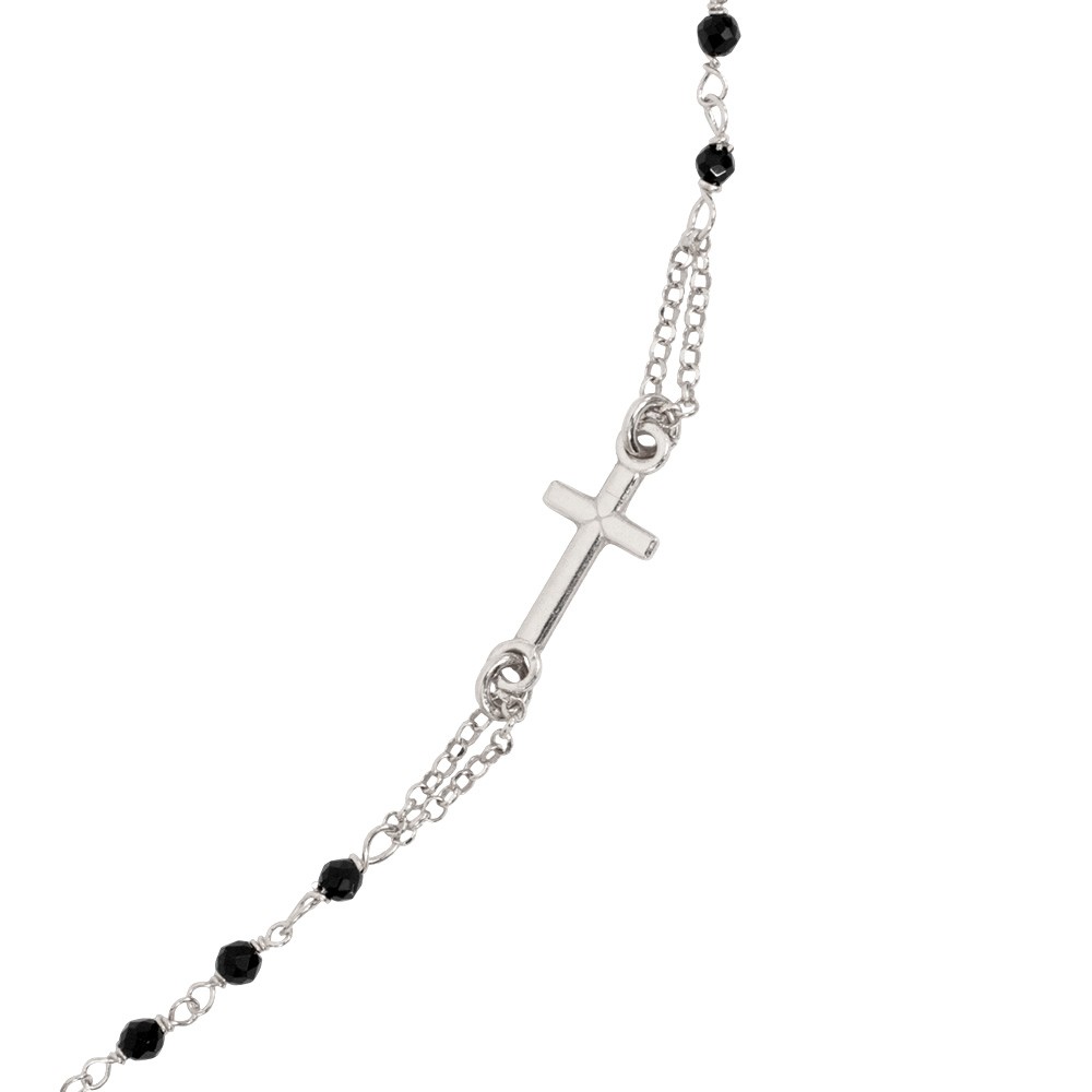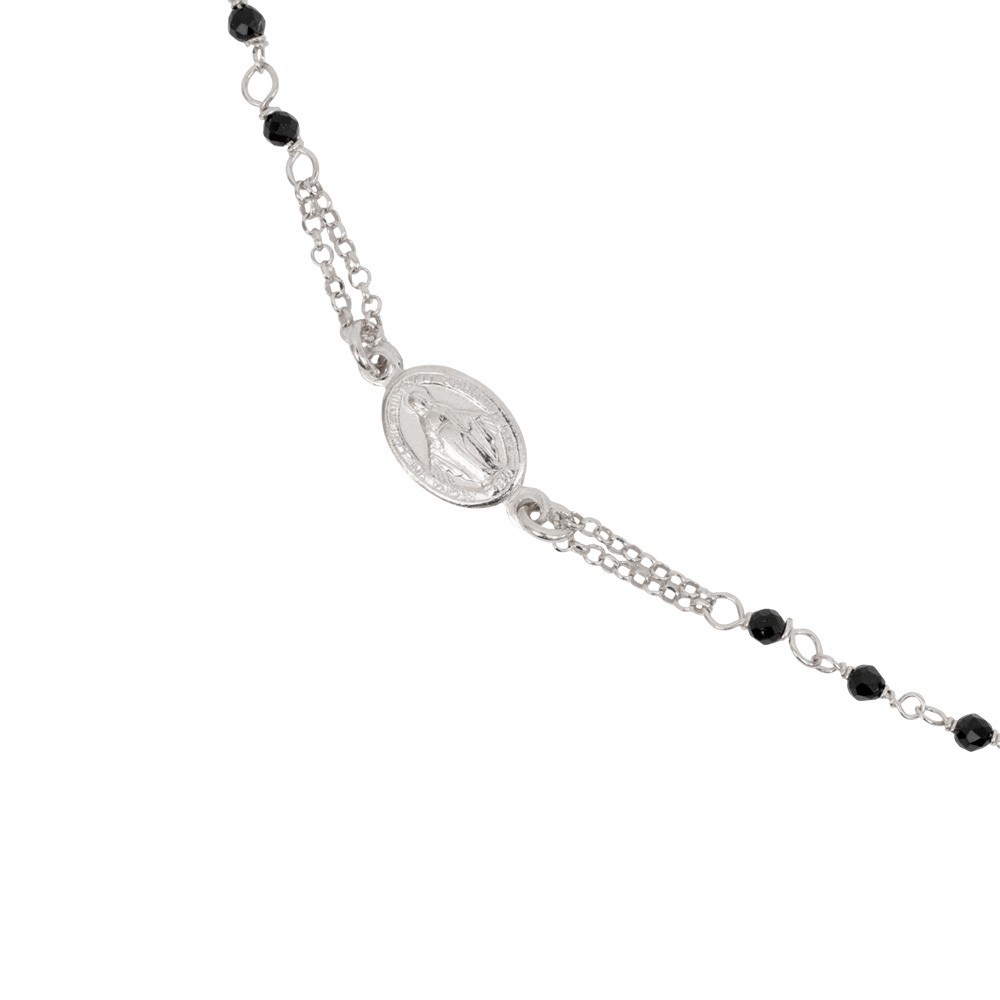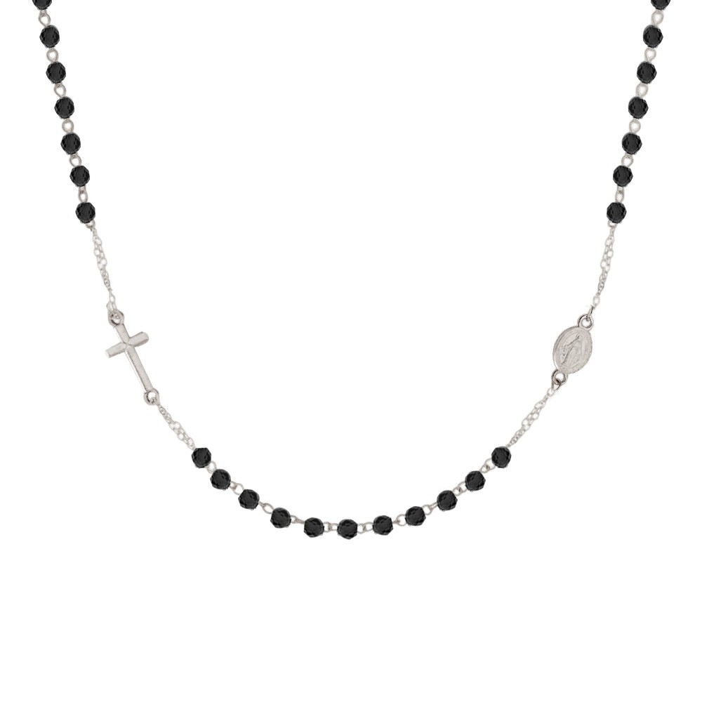 An elegant rosary choker necklace crafted in 925 sterling silver, featuring a silver-finished chain and black beads that add a refined, contemporary touch. Enriched with a cross and the Miraculous Medal of the Virgin Mary.