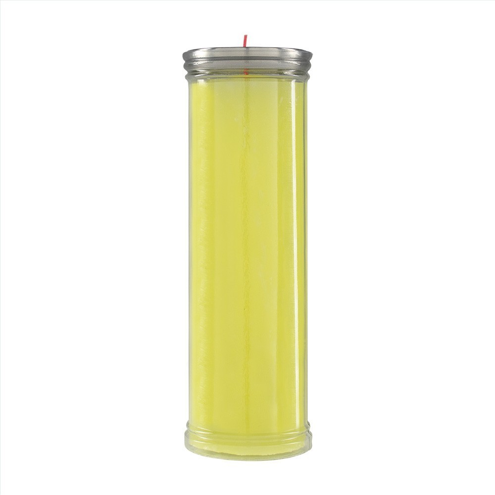 Sanctuary candle in yellow wax packaged in a plastic yellow container. Complete with aluminium wind-proof. This liturgical candle lasts about a week.
