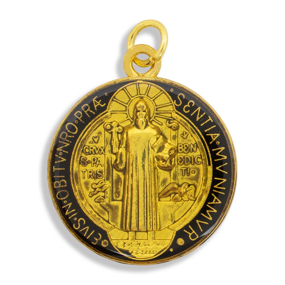 Saint Benedict medal (diameter 3.2 cm) made of gold-plated metal, enameled on both faces.