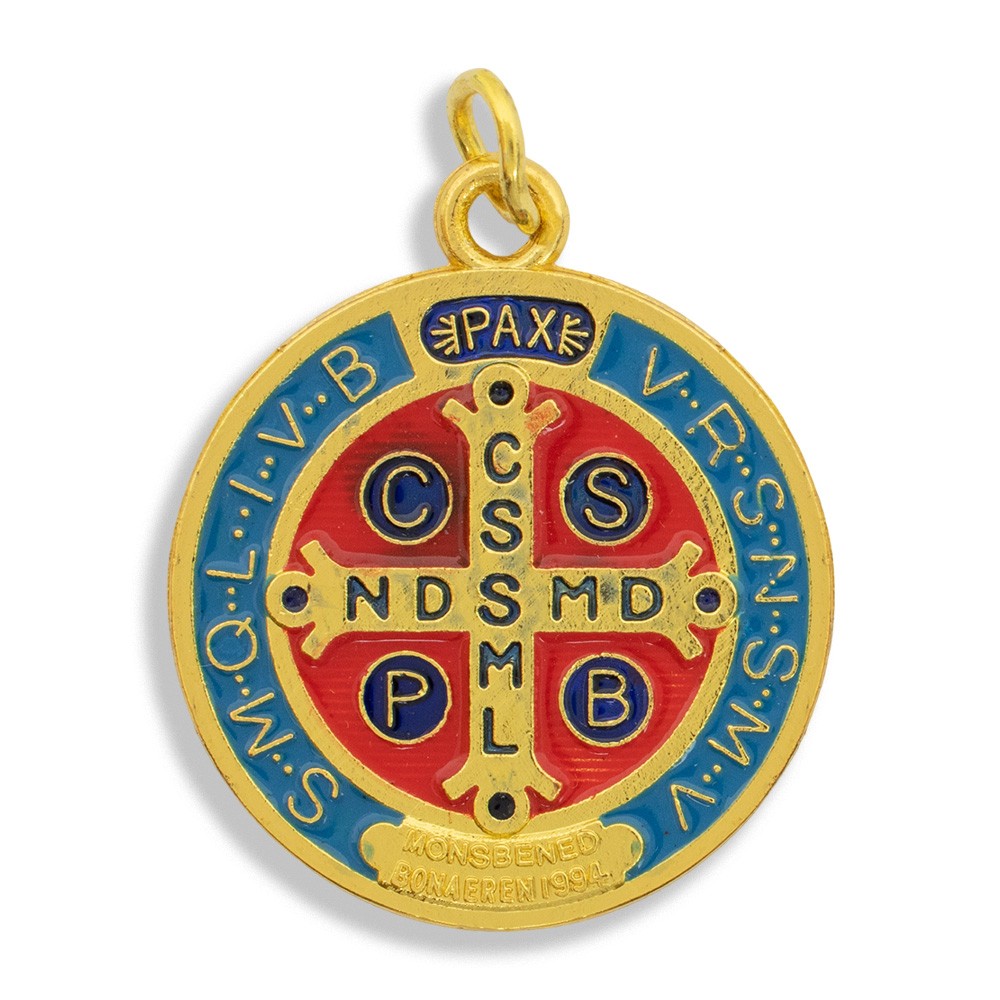 Saint Benedict medal made of gold-plated metal, enameled on both faces.