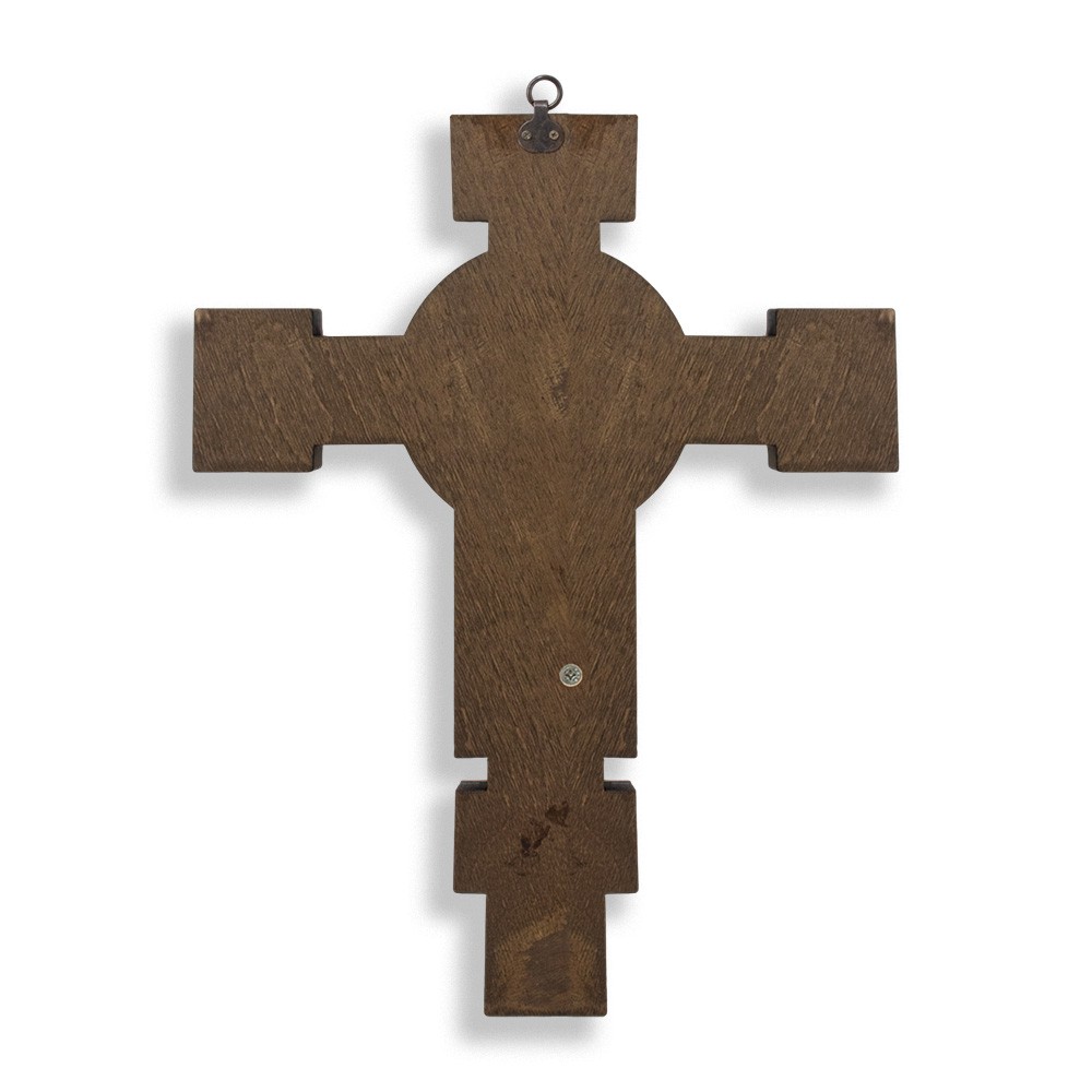 This crucifix is entirely made of enameled wood, whereas the Body of Jesus Christ is made of gold-plated brass and is in relief.