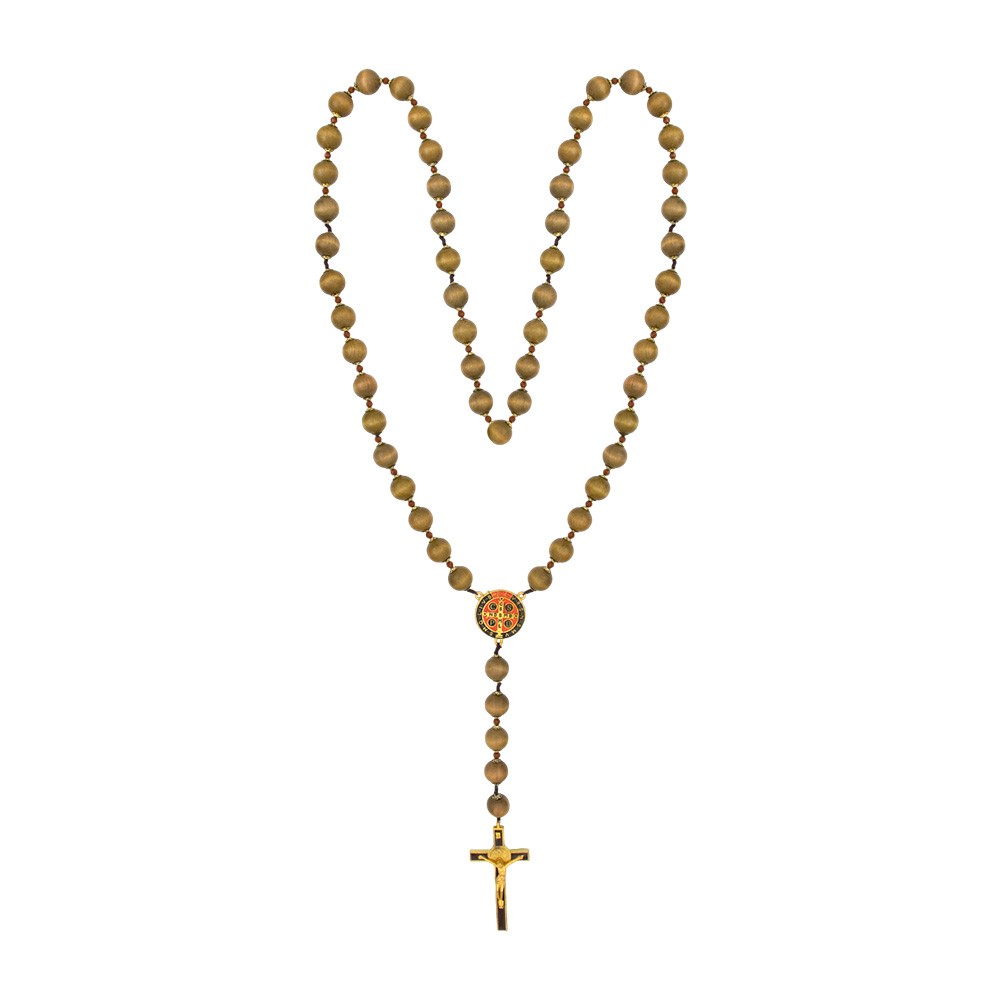 This charming rosary is made with round wooden beads (2 cm diameter), and features a gold-colored, enamelled centerpiece and cross.