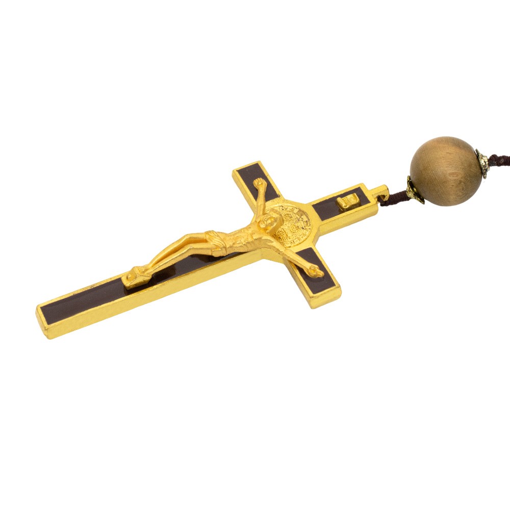 Made with round wooden beads, gold-colored metal cross and centerpiece, enamelled.