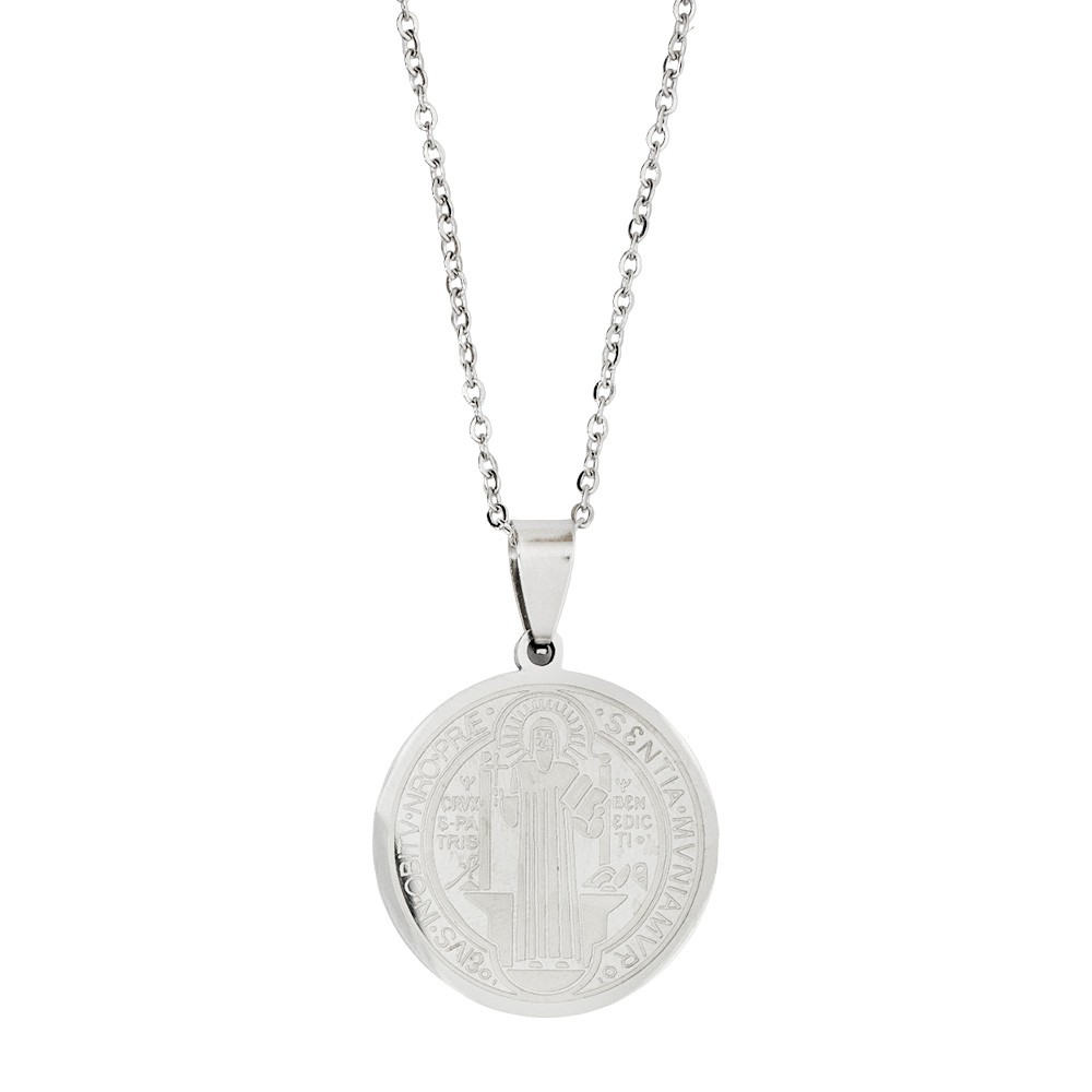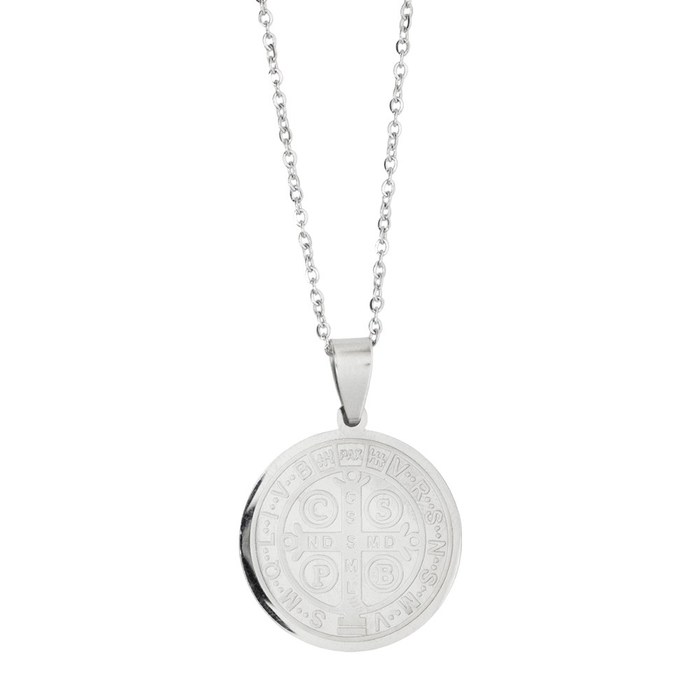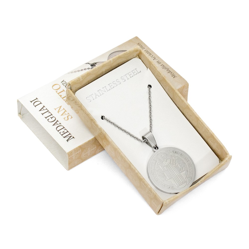 Complete set with round Saint Benedict medal and stainless steel chain, featuring a clasp for easy opening.