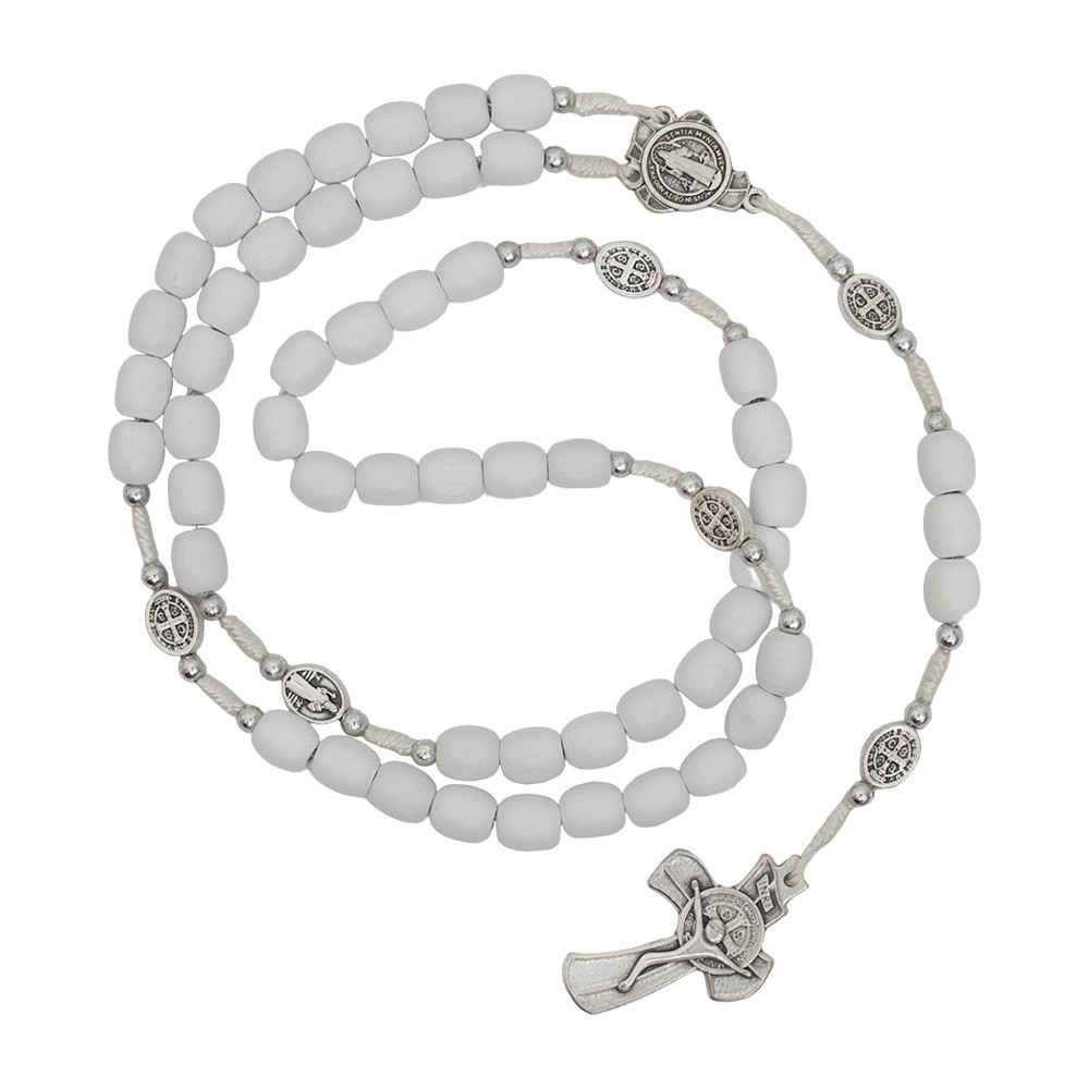 This Saint Benedict rosary is a symbol of devotion and protection. Crafted with white-colored oval wooden beads, bound with durable cord, and adorned with a centerpiece, a cross, and silver-toned Saint Benedict medals.
