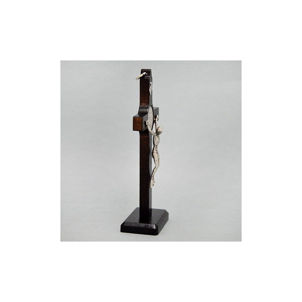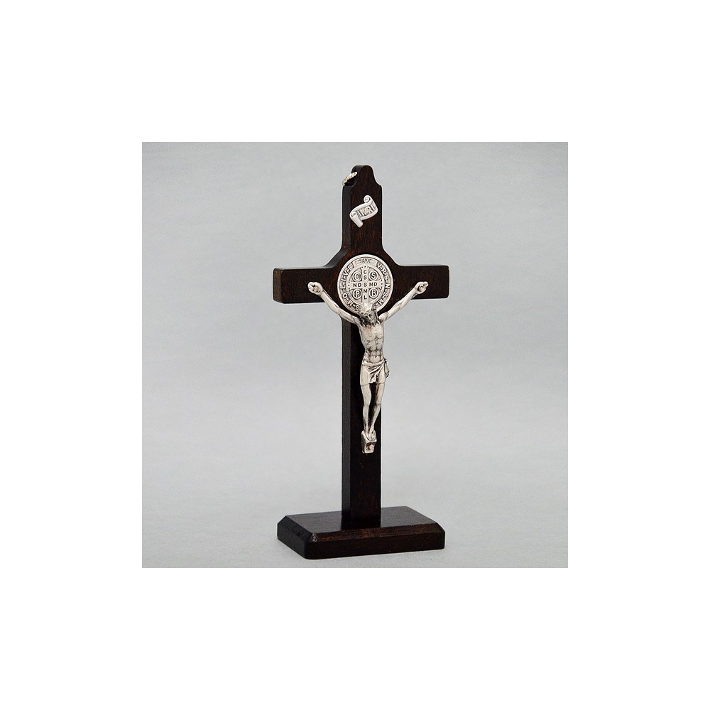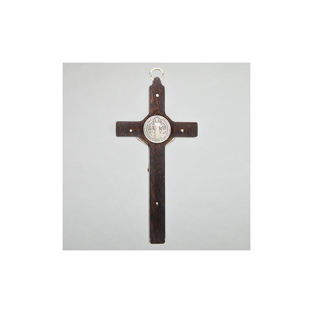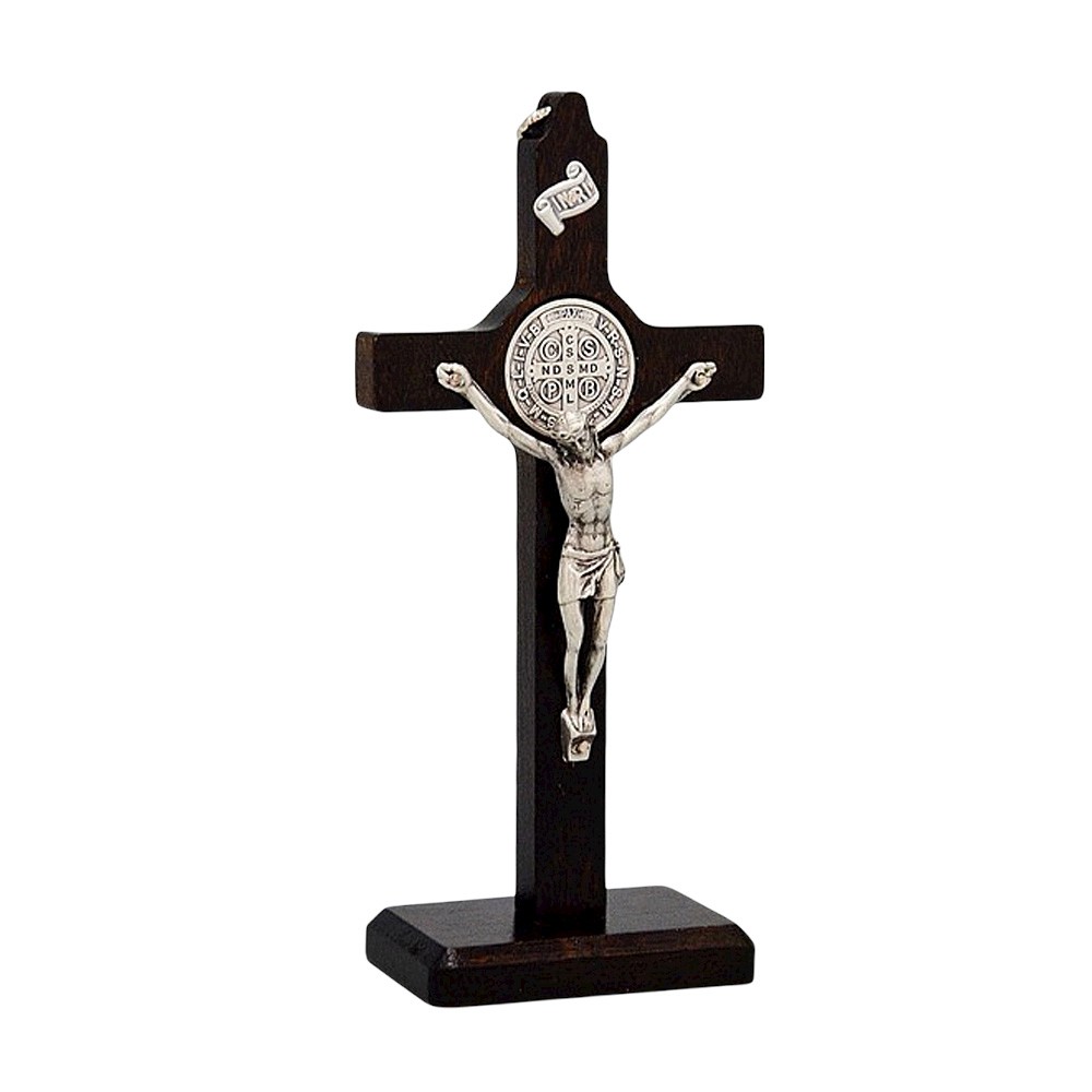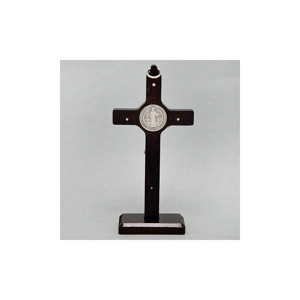 Cross of Saint Benedict of Norcia in wood with medal on the front and back. In the box you will also find a base of the same color in order to turn it into a table cross. Supplied with transparent box. Made in Italy.