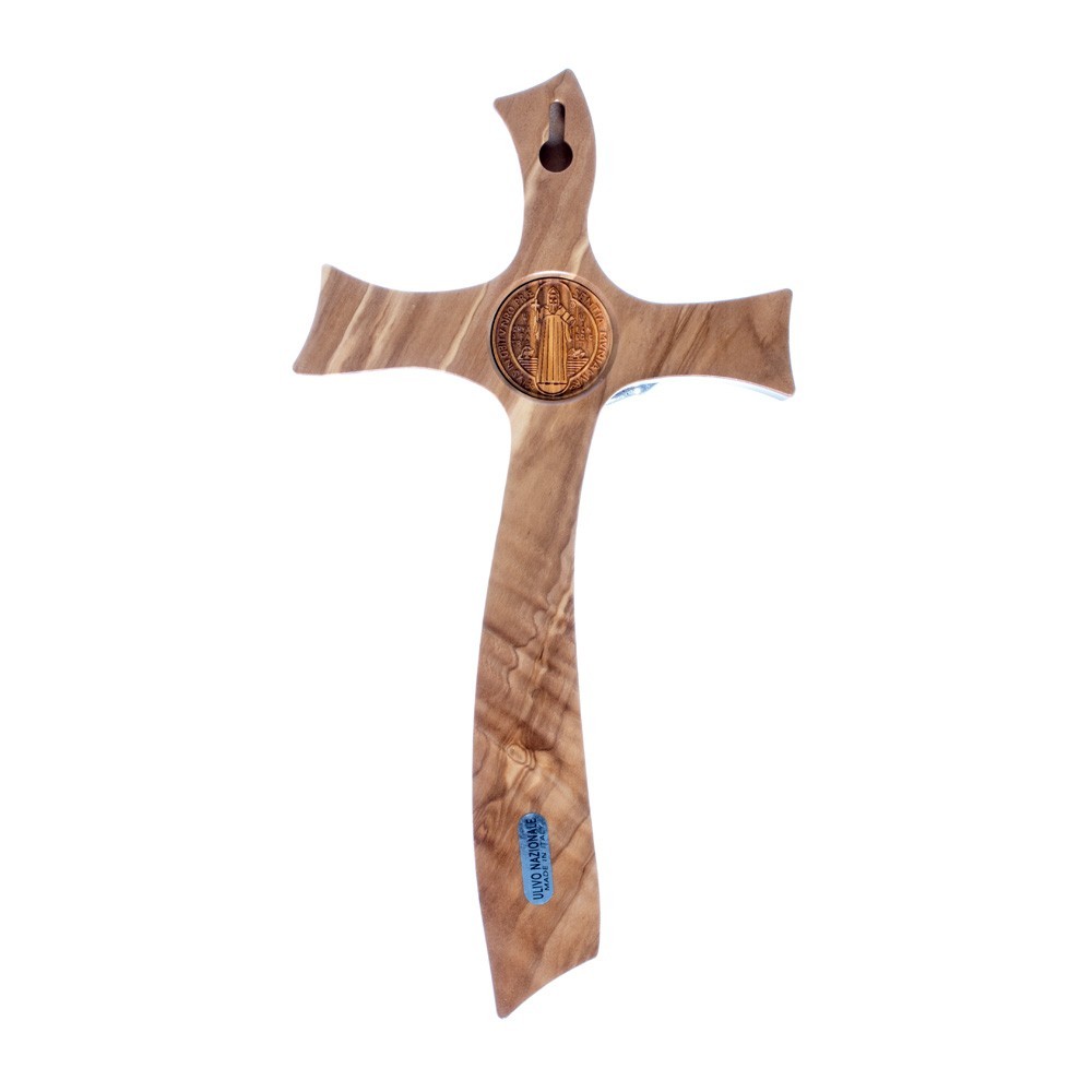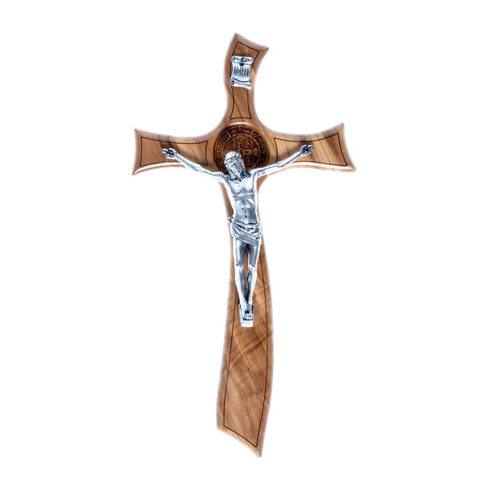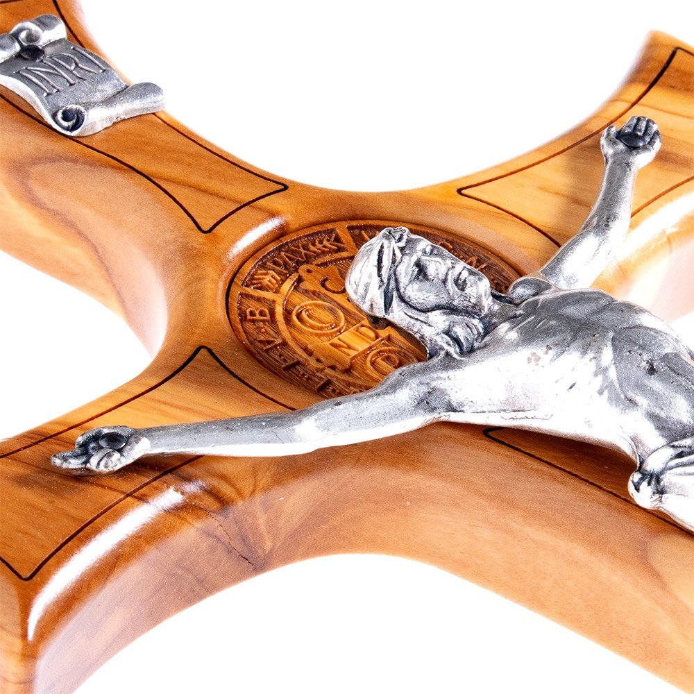 Saint Benedict Cross – Crucifix of the Good Death and medal. This crucifix is made of Italian olive wood and has a medal of Saint Benedict carved in wood. Body of Christ and INRI writing are made of silver metal. The crucifix is produced using traditional Italian manufacturing techniques.
