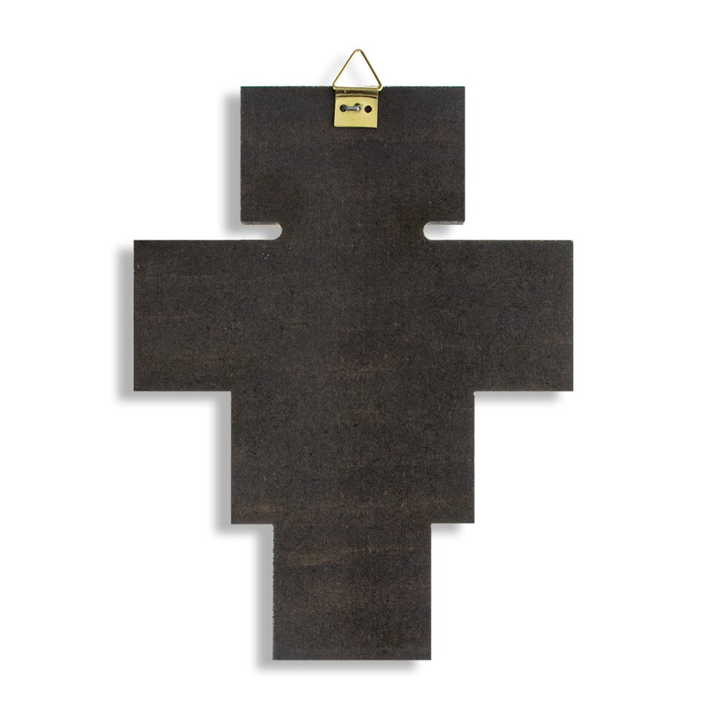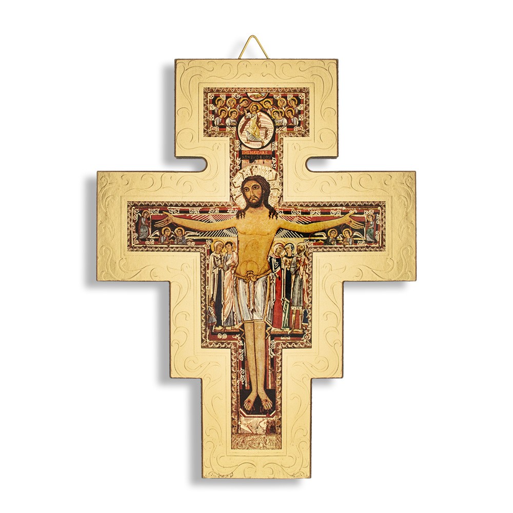 Crucifix of Saint Damian in MDF wood with golden stylized ornaments.