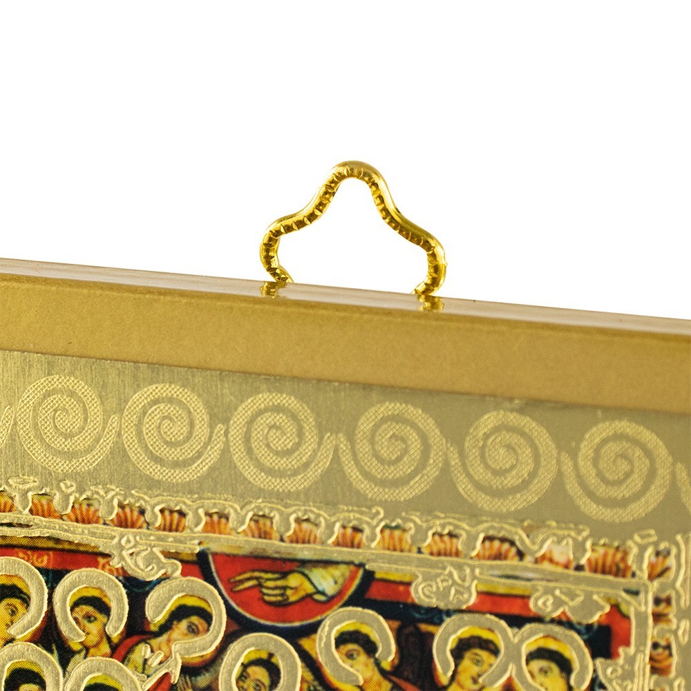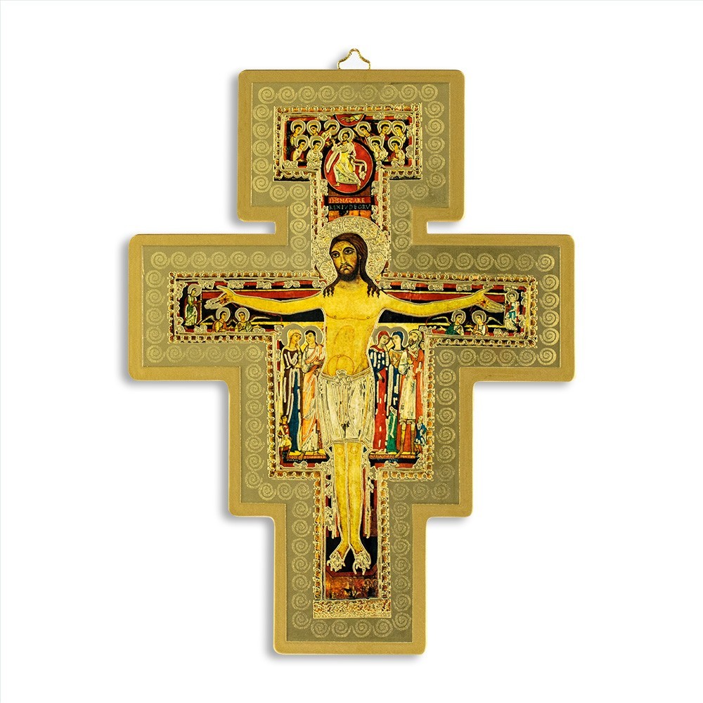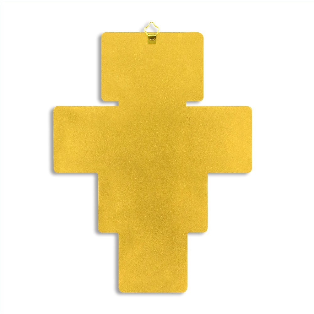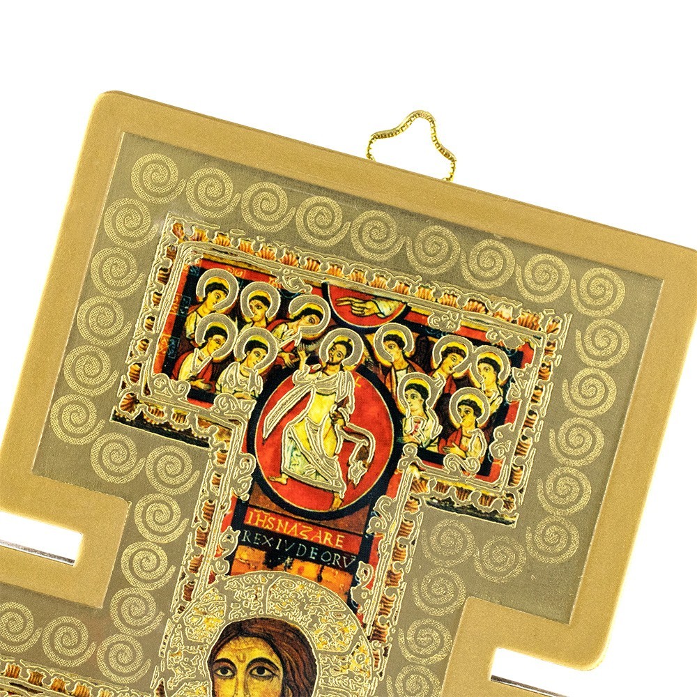 This cross of Saint Damian is made of gold foil on wood. Equipped with gold metal triangle and packed in transparent plastic box. Entirely made in Italy.