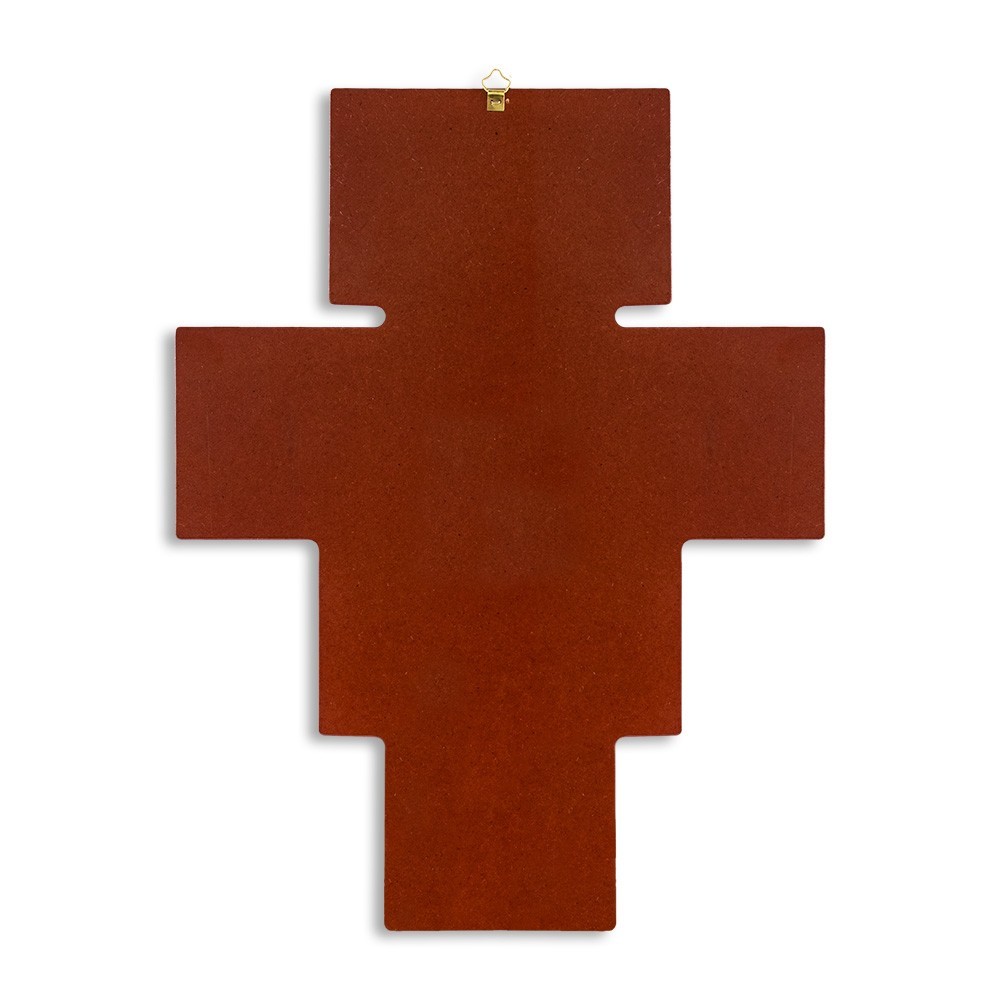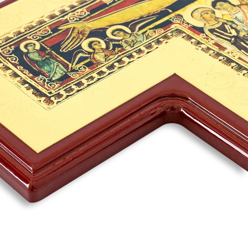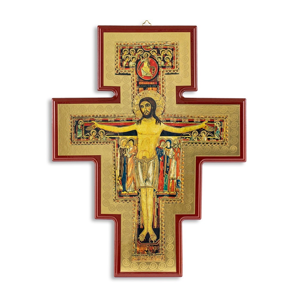This cross of Saint Damian is made of colored silver and is sprayed in red on the back. Equipped with gold metal triangle and packed in a transparent plastic box. The cross is around 40 cm tall and 30.2 cm wide. Entirely made in Italy.