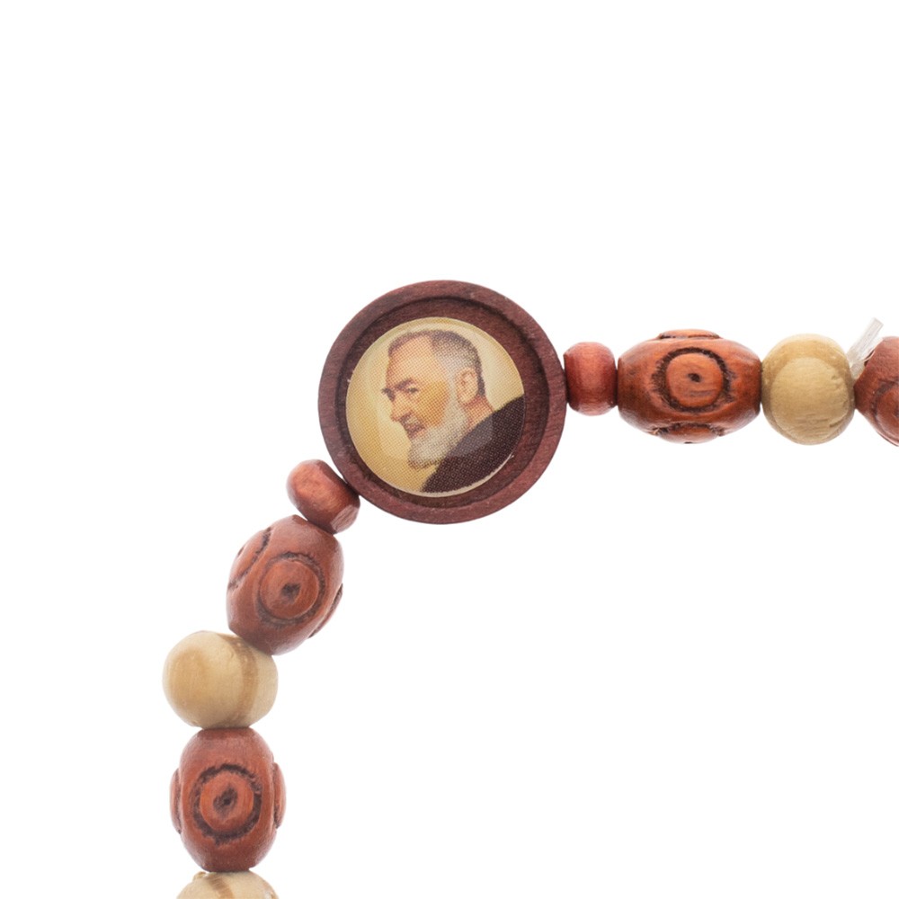 Bracelet with medal of Saint Pio and grains in wood; suitable for children. The grains are of oval shape and made of dark wood, alternated with smaller round grains in light wood.