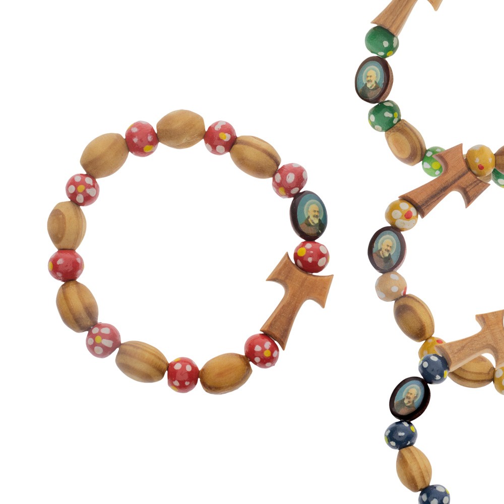 Kids bracelet complete with tau cross, oval medal of Saint Pio, beads in light wood and multicolored beads.