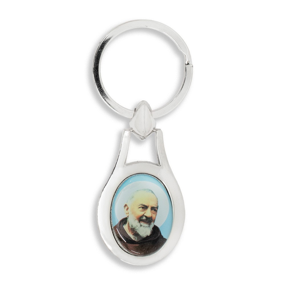 Saint Pio keychain made of silver-colored metal with an enameled image of the Saint.