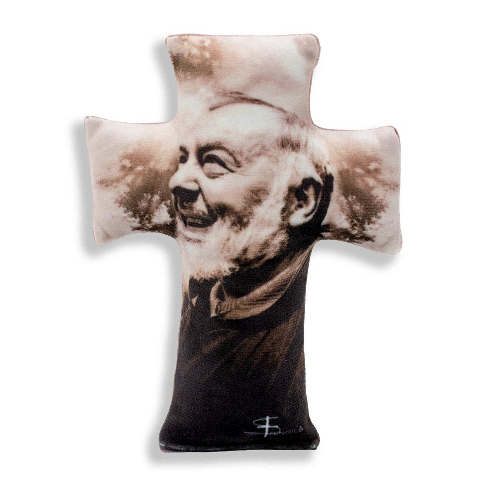 2023 innovation: cross-shaped pillow with padding and front image depiction Saint Pio. It comes from the STRINGILA collection.