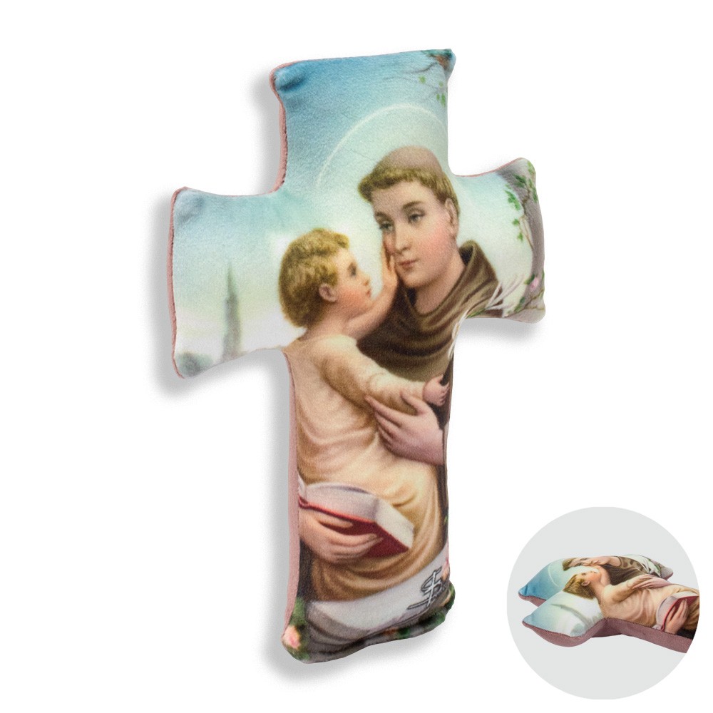 Cross-shaped pillow with synthetic padding and depicted image of Saint Anthony of Padua on the front. It comes from the STRINGILA collection.