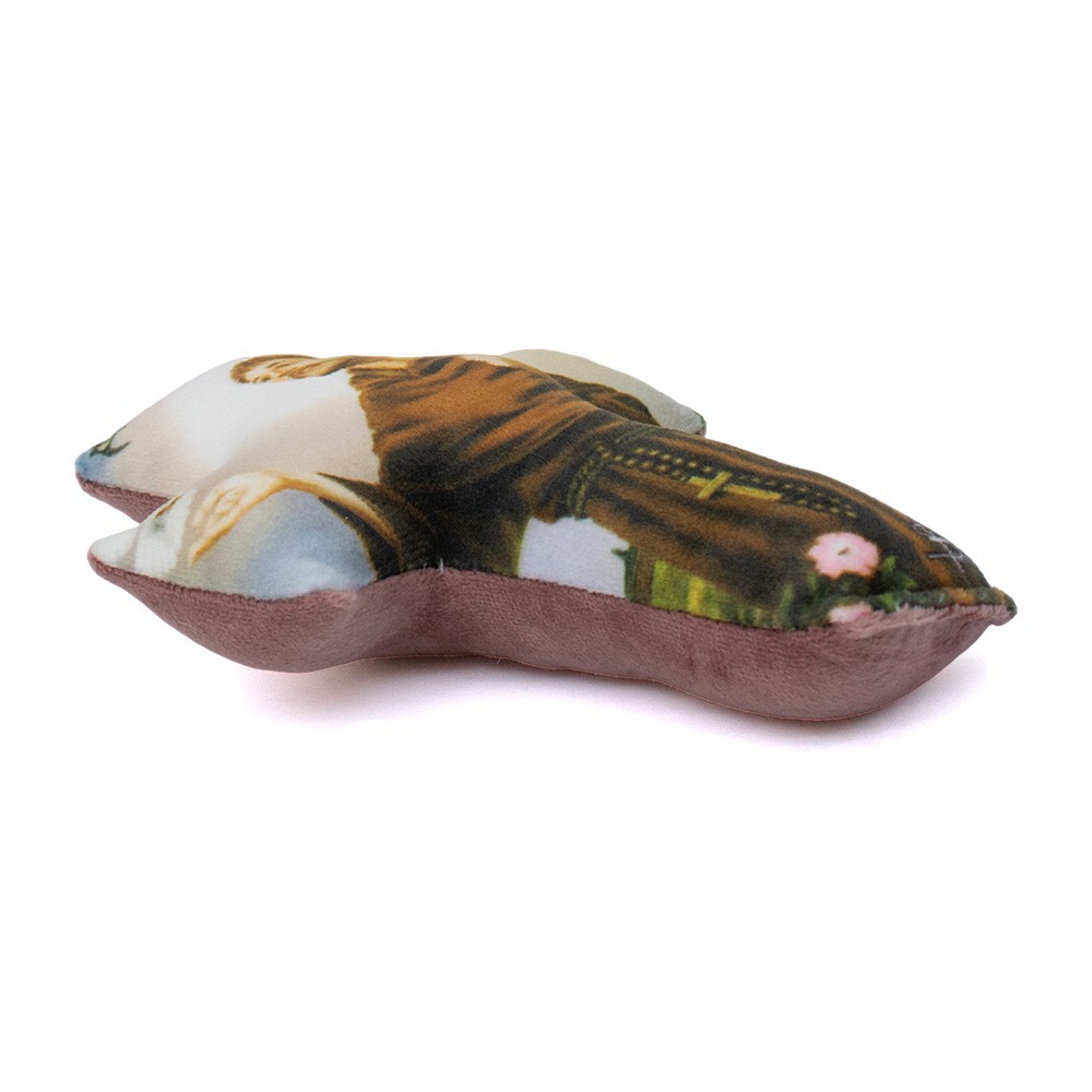 Cross-shaped pillow in velvet, complete with synthetic lining. Enriched with front image of Saint Francis Of Assisi.