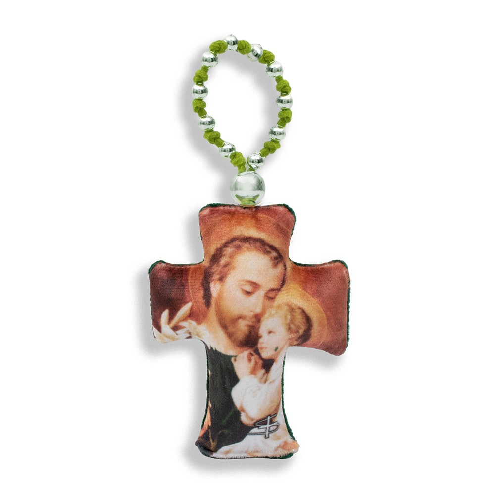 This cross is made of velvet with printed image of Saint Joseph on the front, size 8x6 cm. The color on the back of the cross-shaped pillow may vary, but always matches the front image.