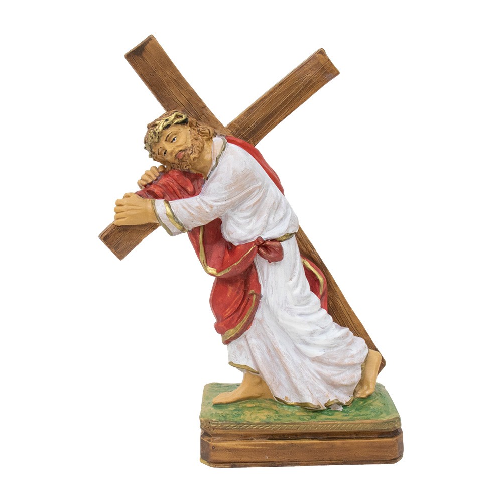 Holy statue depicting Jesus carrying the cross on his shoulder, handpainted with wood type colors. Height: approx. 19 cm.