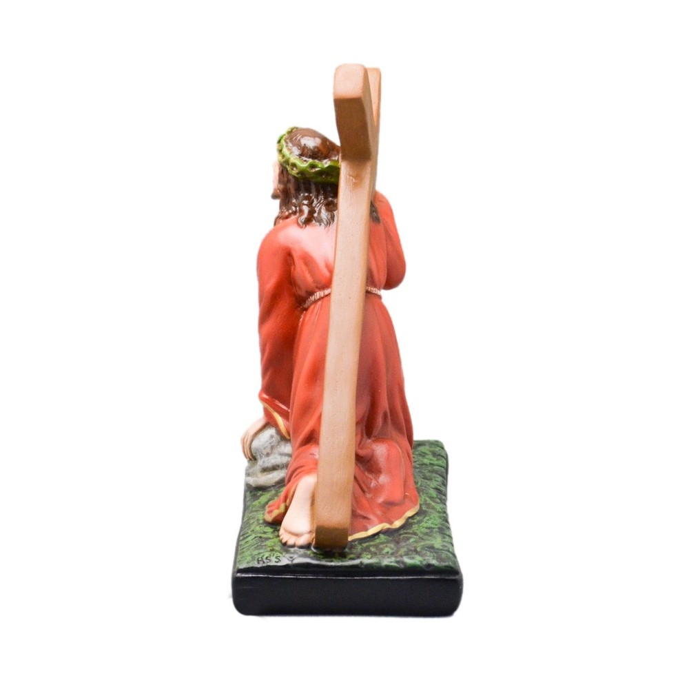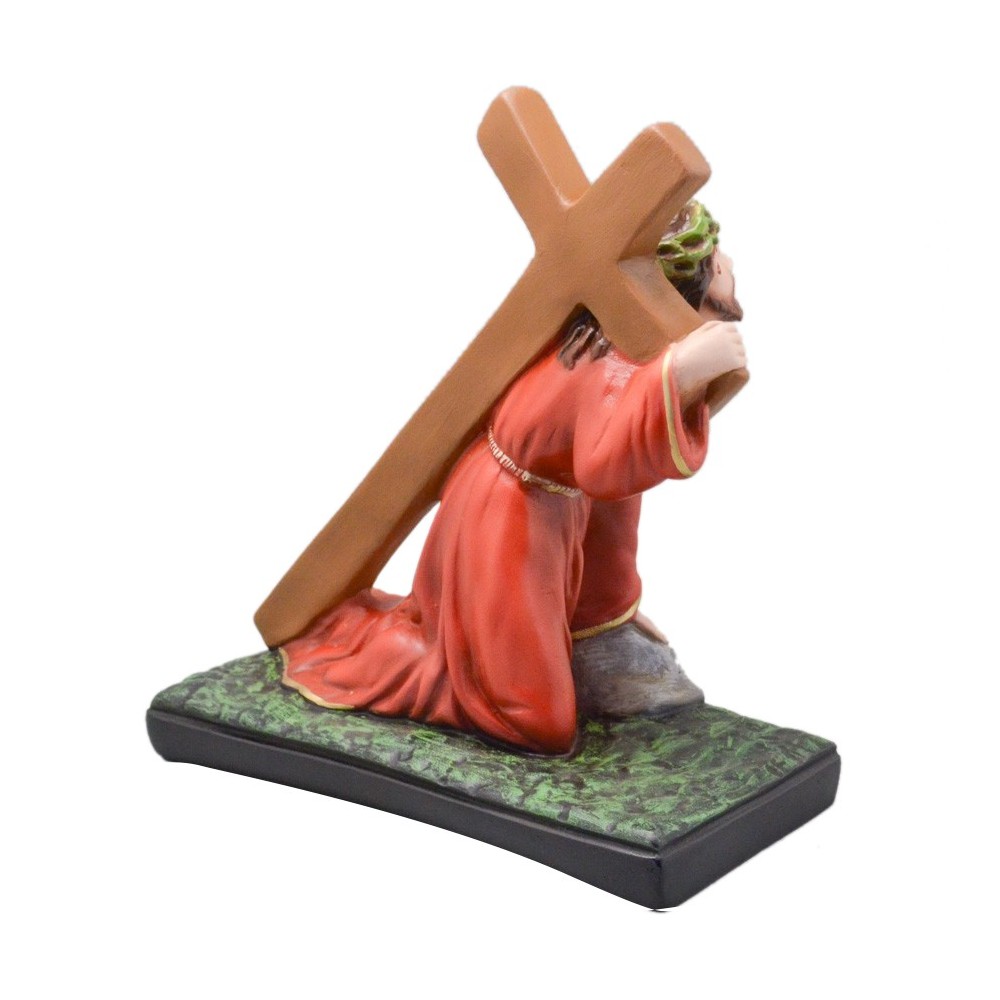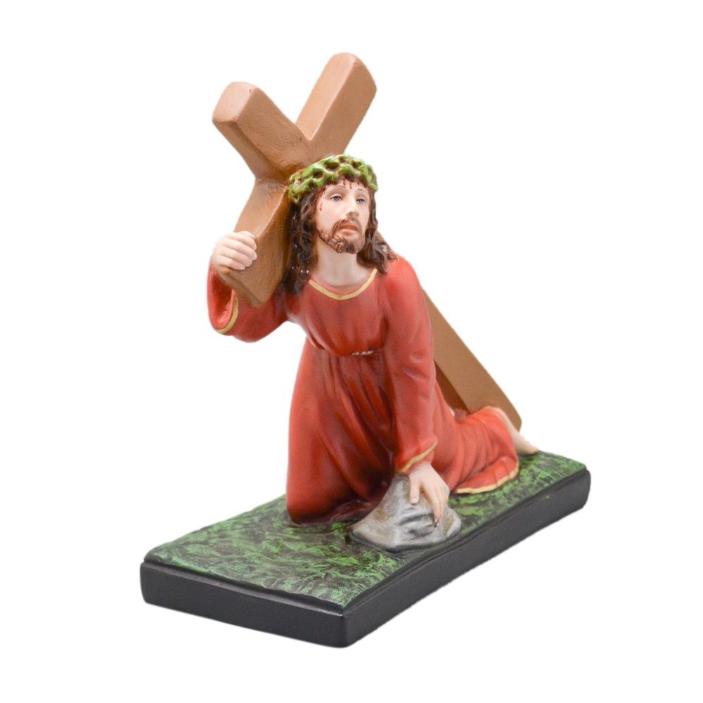 Resin satue depicting Jesus on his knees under the weight of the cross. Handpainted with care by highly skilled workers. This statue is made in Italy by a company which has been in the market for more than 30 years. Boxed.