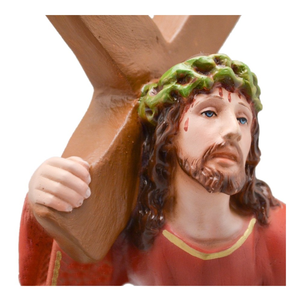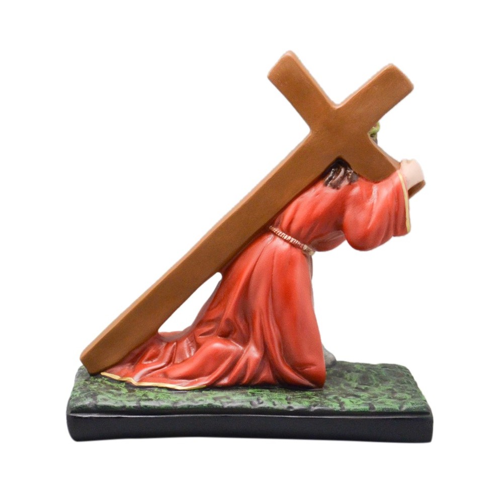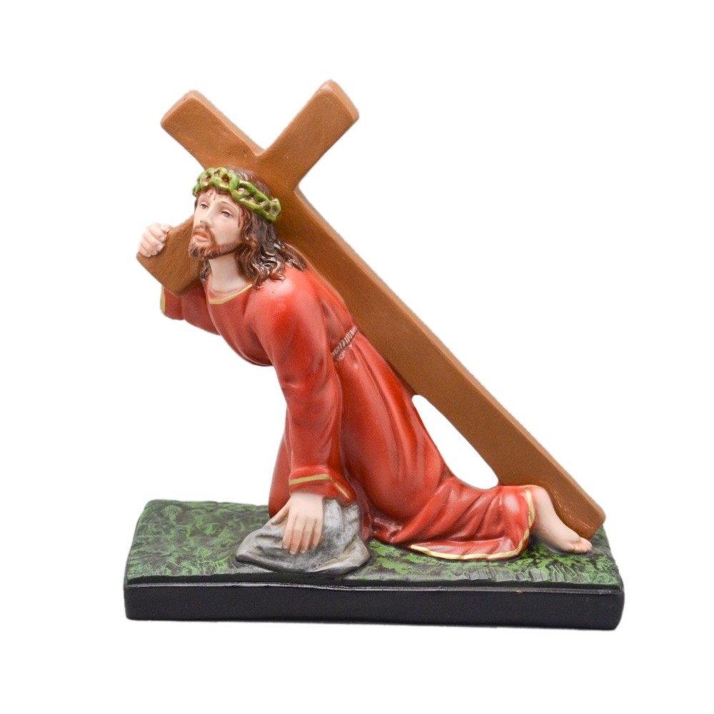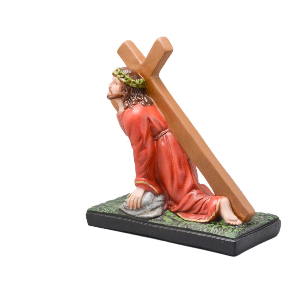 Resin satue depicting Jesus on his knees under the weight of the cross. Handpainted with care by highly skilled workers. This statue is made in Italy by a company which has been in the market for more than 30 years. Boxed.