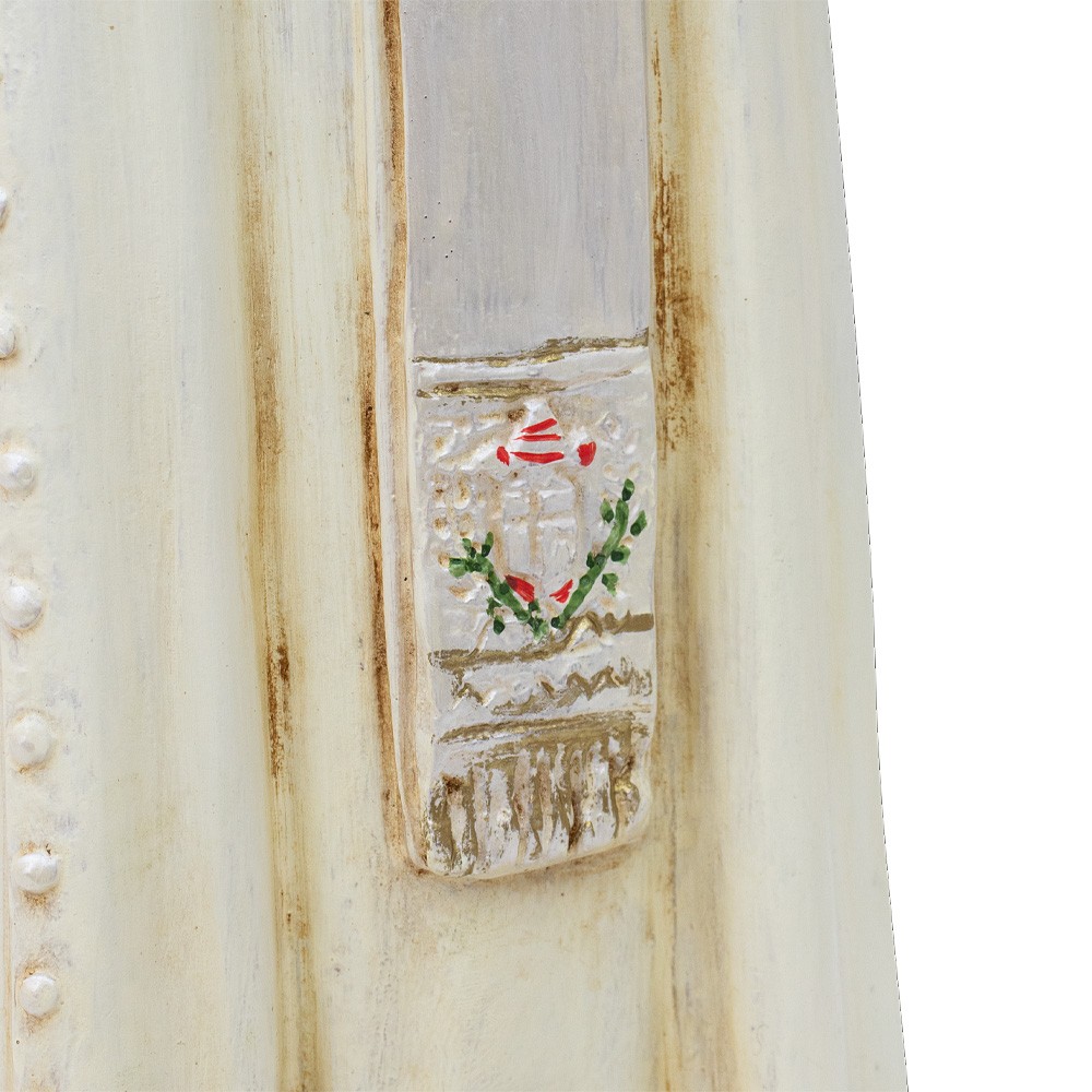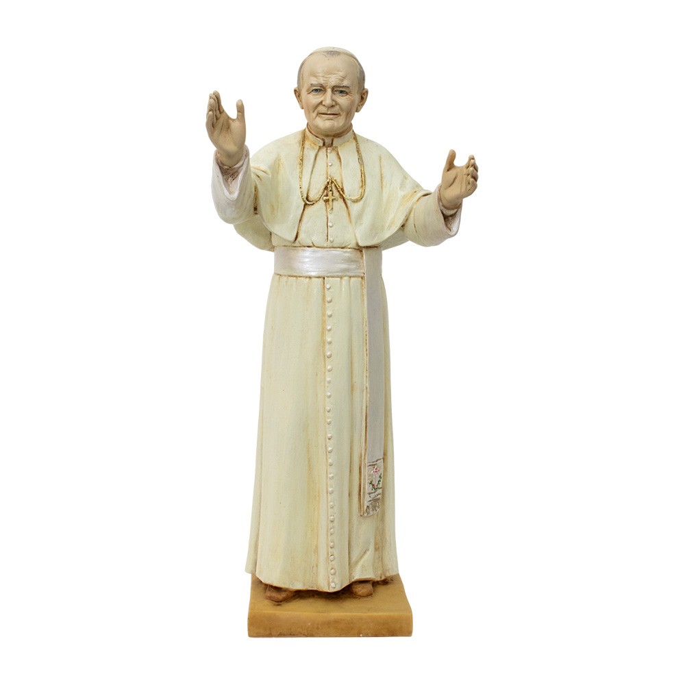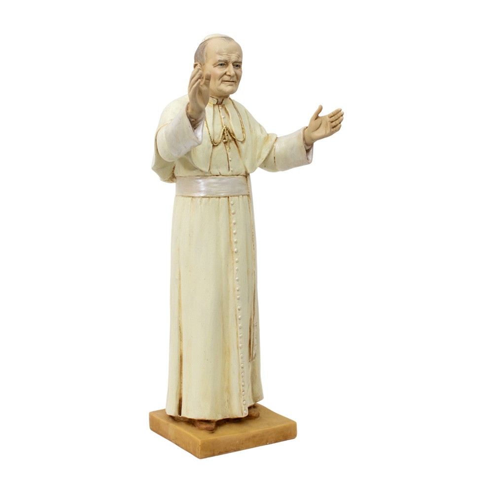 Statue of Pope John Paul II with white chasuble and zucchetto; it is about 50 cm tall.