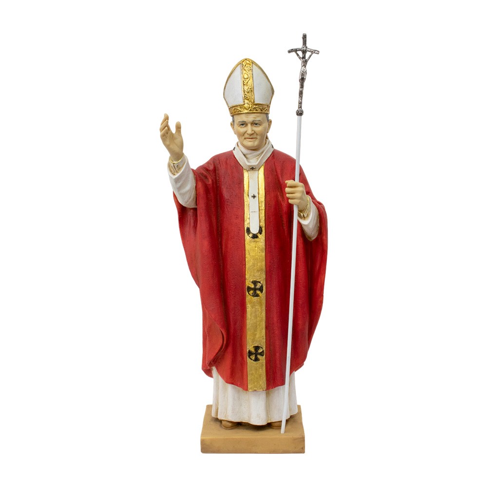 Statue of Pope John Paul II with red chasuble and mitre; it is about 50 cm tall.