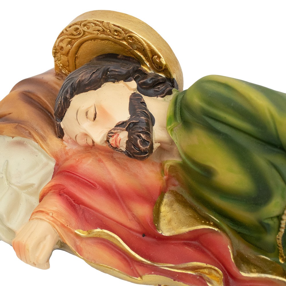Sleeping St. Joseph statue made of colored resin, approximately 19.4 cm in length. Comes with a box.