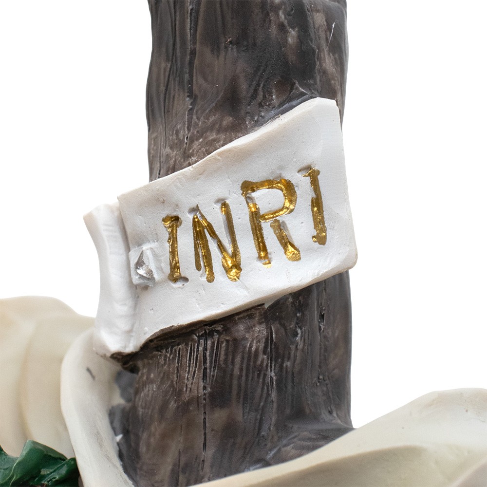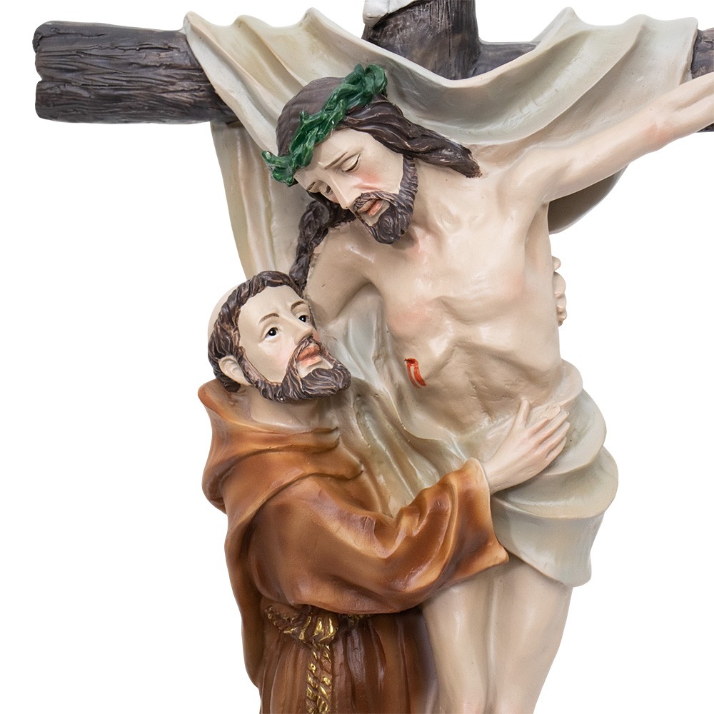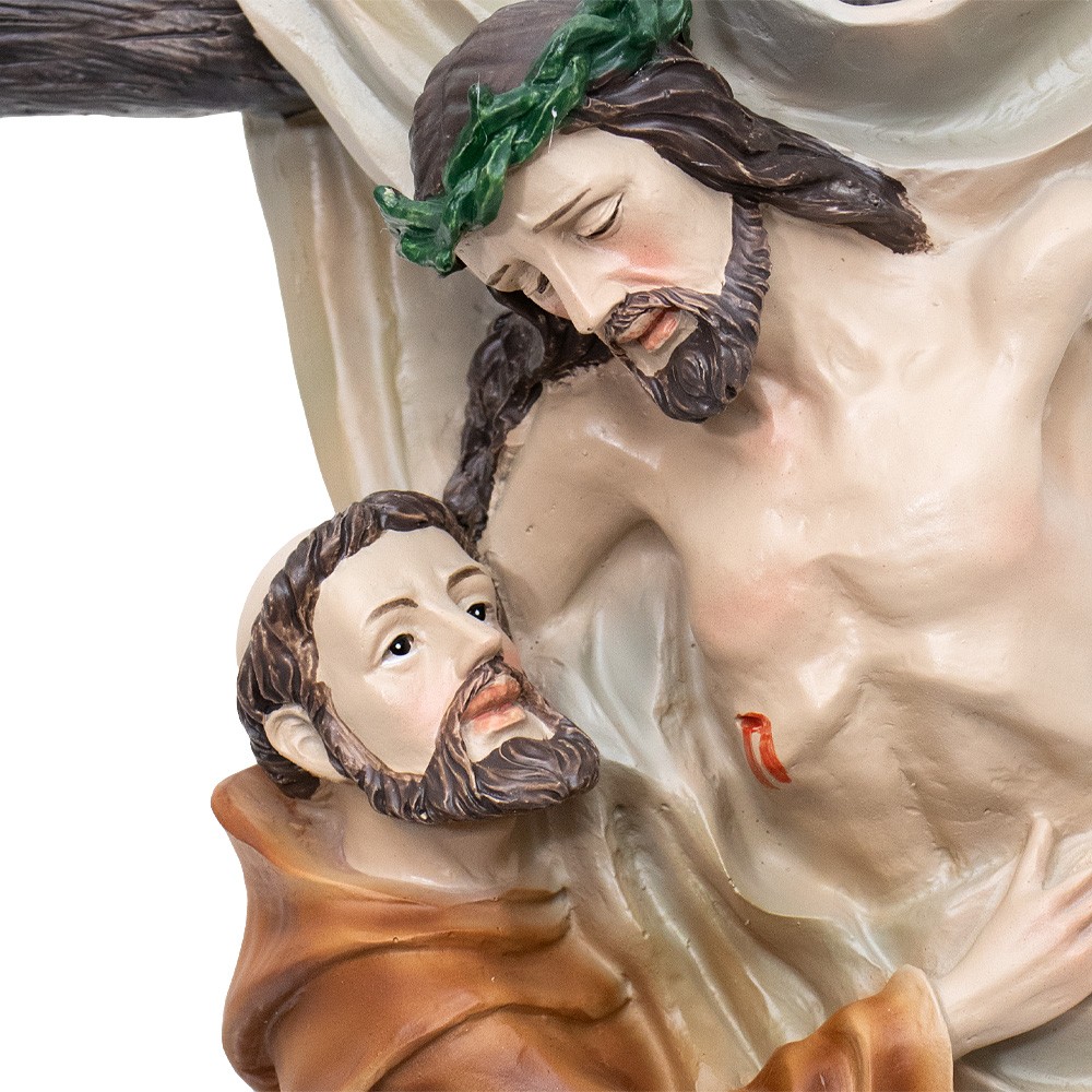 This sacred resin statue depicts Saint Francis laying Jesus on the cross.