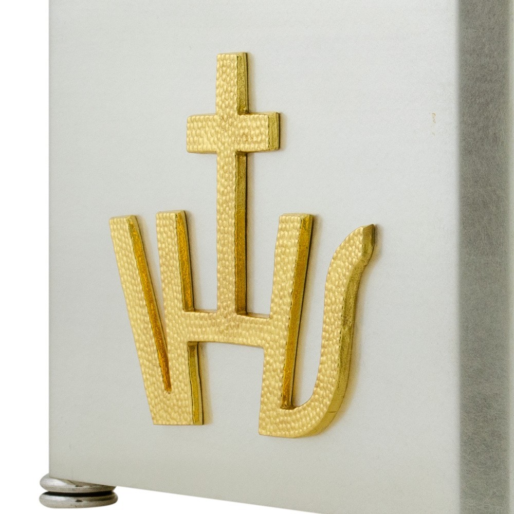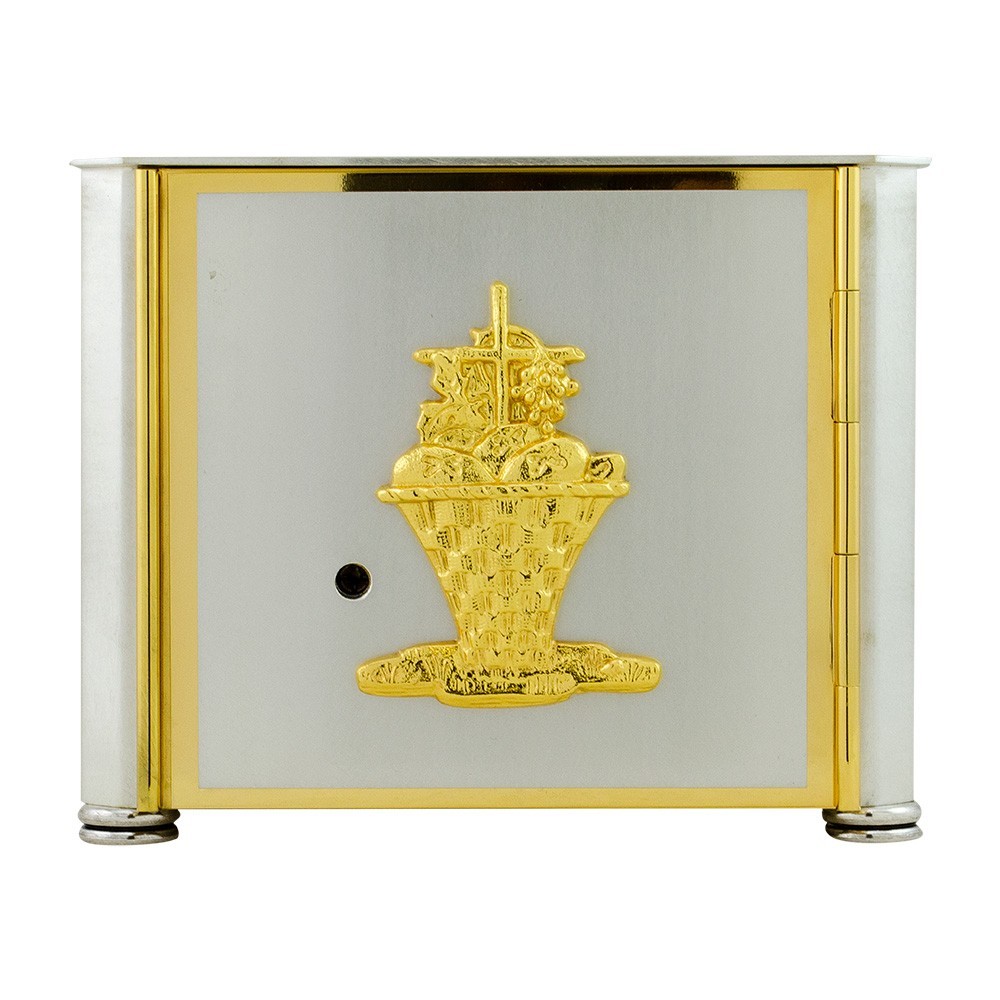 This sacred furnishing is present in all Catholic Churches. Made of brass with silver and satin finish. The door is decorated with relief motifs of eucharistic symbols (bread with grape and cross) in the front and JHS symbol on the back. The door is provided with safety lock.
