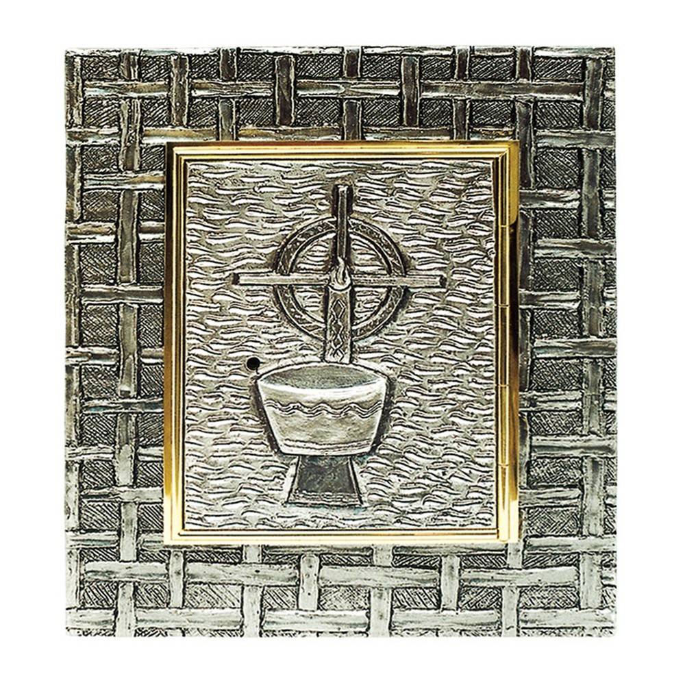 Wall tabernacle in brass. The door has decorations of the eucharistic symbols of chalice and cross, measures 20x24 cm and is provided with a safery lock. The exterior of the tabernacle measures 35x40 cm.