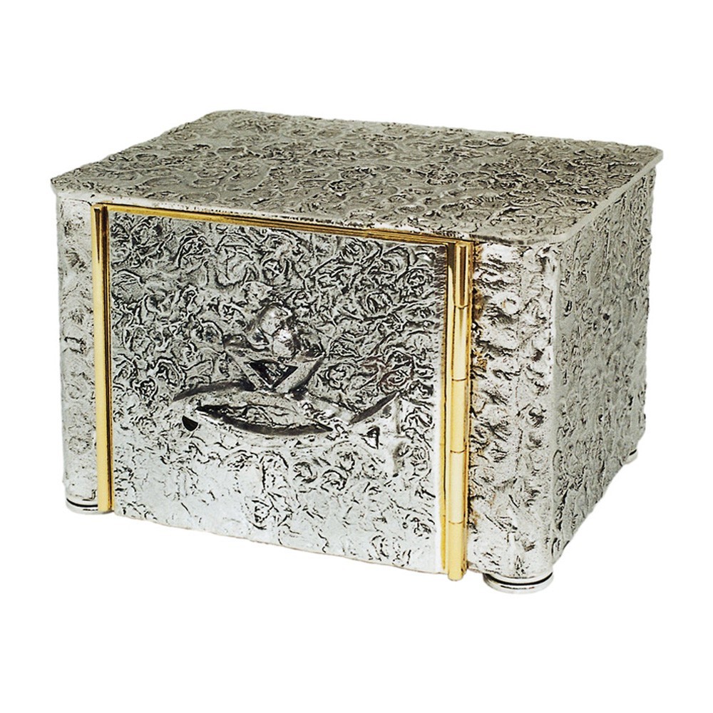 This altar tabernacle is made of brass. Its door depicts a stylized bread basket and is provided with a safety lock.
