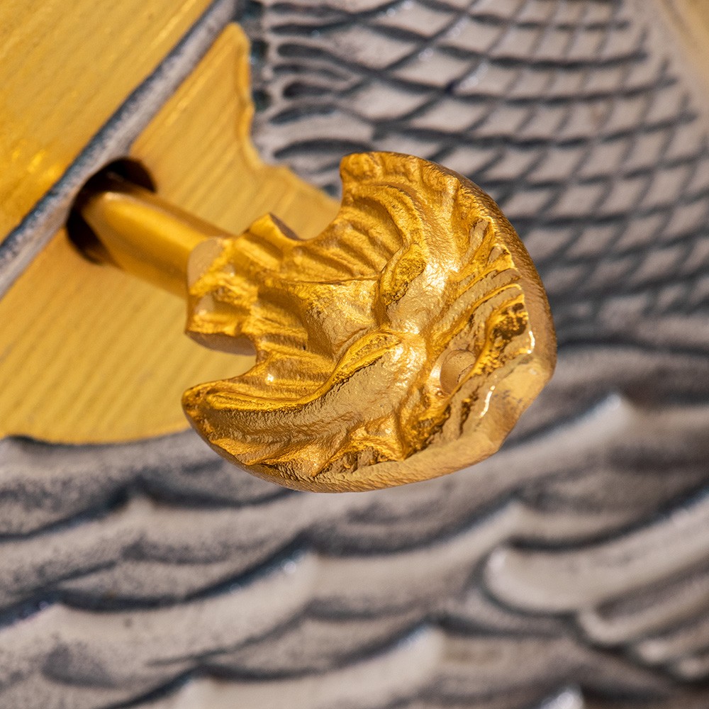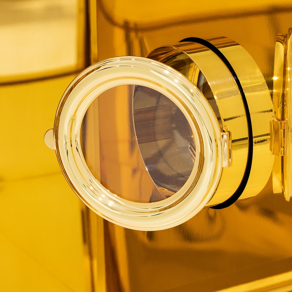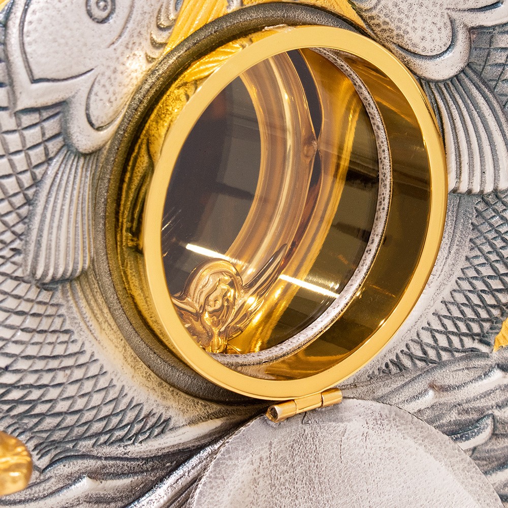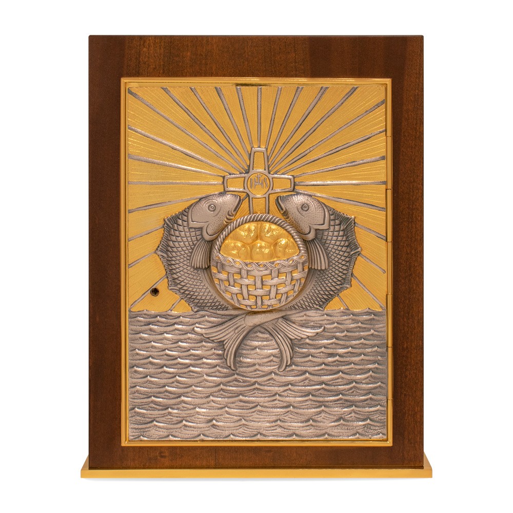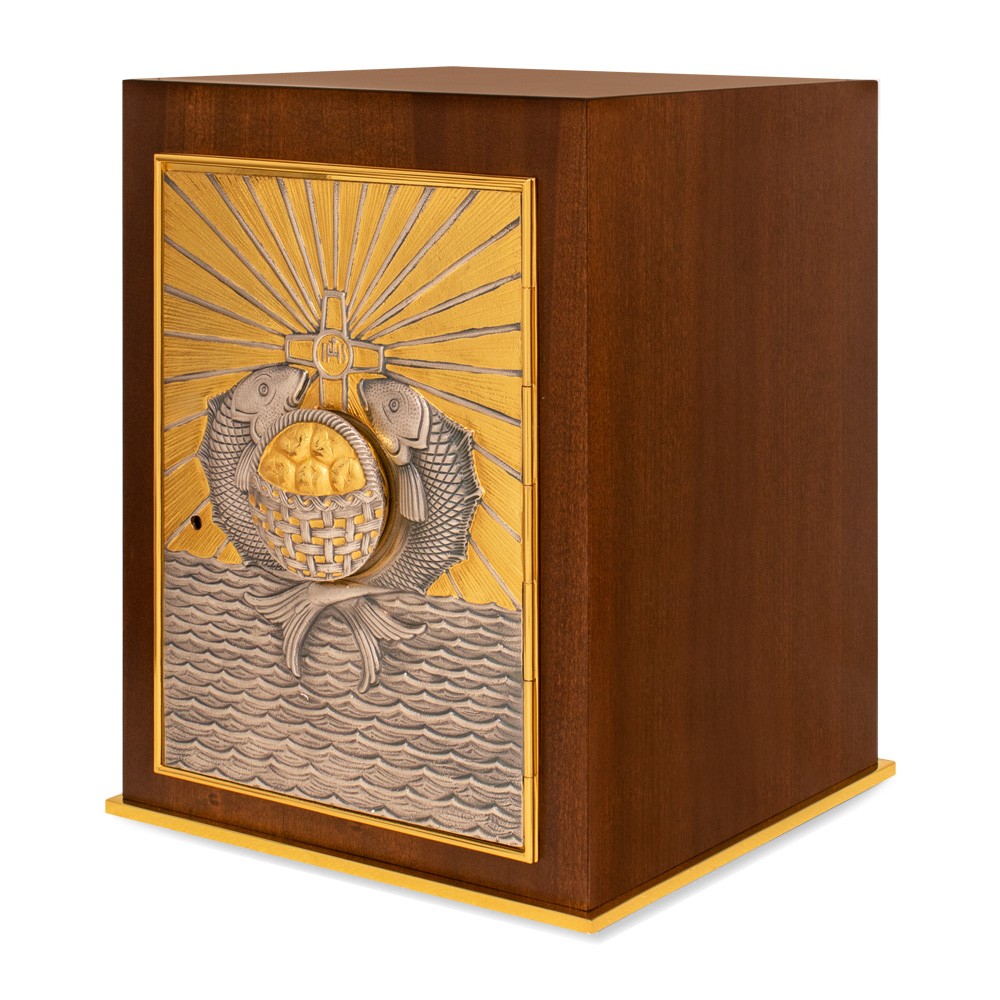 This beautiful tabernacle is made of wood, while the door is made of brass with two-tone finish. The tabernacle door is enriched with the Eucharistic symbols JHS, Bread and Fish. The internal walls are made of gold-plated brass sheets. Equipped with safety lock and three keys. In the center of the door there is an openable porthole for the exposition of the Blessed Sacrament.