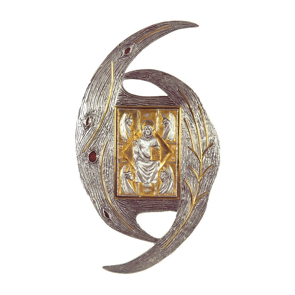 Built-in tabernacle in brass with two-tone door in gold and silver finish. This tabernacle is equipped with internal light, safety lock and three keys. The door depicts Christ Pantocrator with the symbols of the four Evangelists.