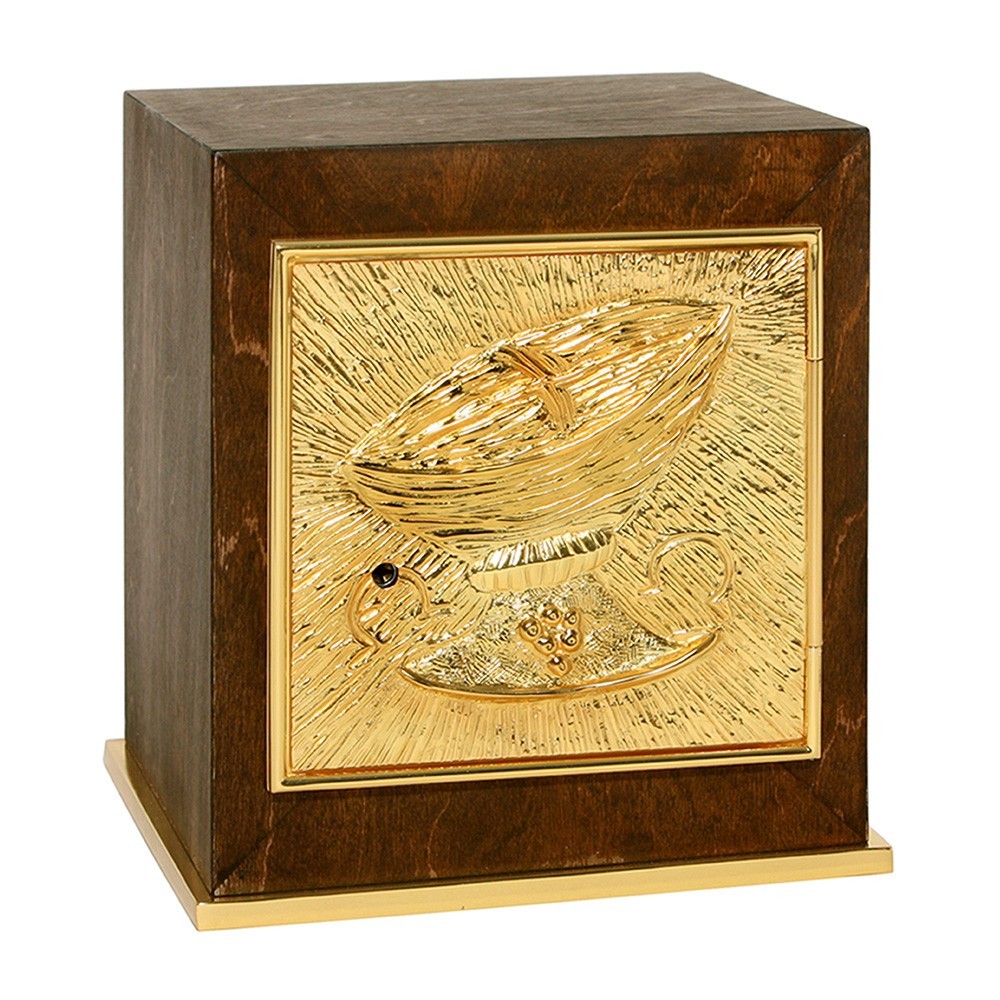 Tabernacle in wood and brass with depicted image of the Sacred Heart of Jesus.