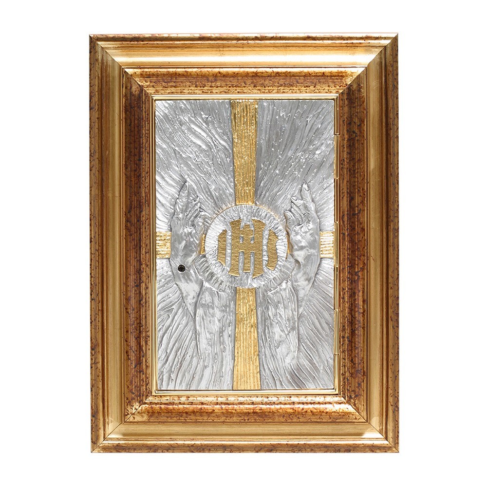 Wall-mounted tabernacle with exposition of the Blessed Sacrament. Made of golden and silver-plated brass. The door depicts a stylized cross and praying hands with JHS symbol in the middle. This altar tabernacle has a small window on the door which can be opened for the exposition of the Blessed Sacrament.