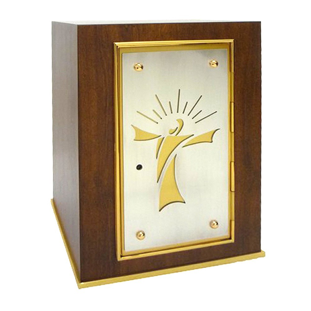 Tabernacle in wood and brass with depicted image of the Sacred Heart of Jesus.