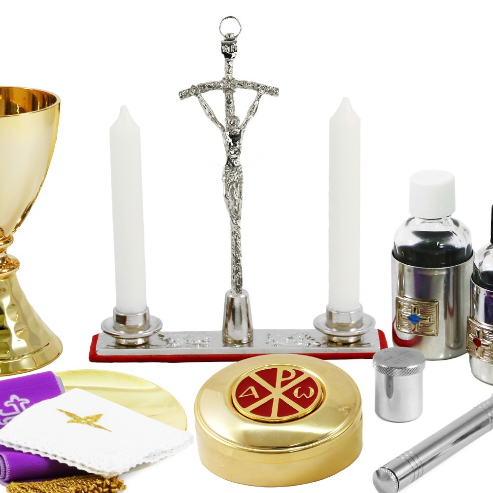 Satin bag with pyx, cross and purifier. Size: 9x12 cm.