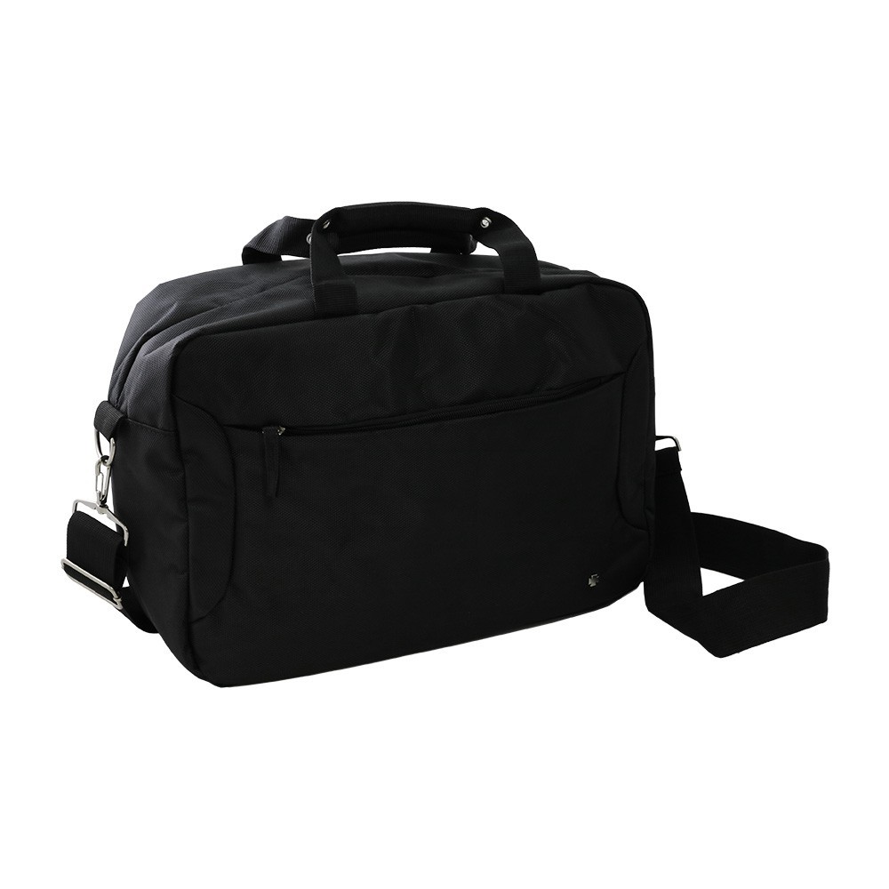 Mass kit computer bag. This practical bag is made of black eco-friendly leather. Provided with adjustable shoulder strap and extractable storage compartment in blue moirè satin.