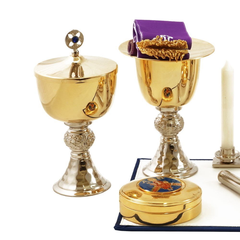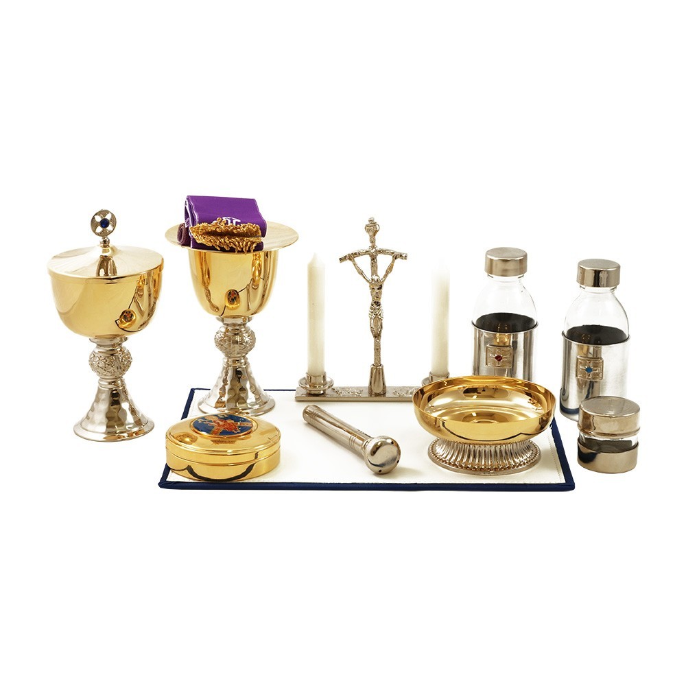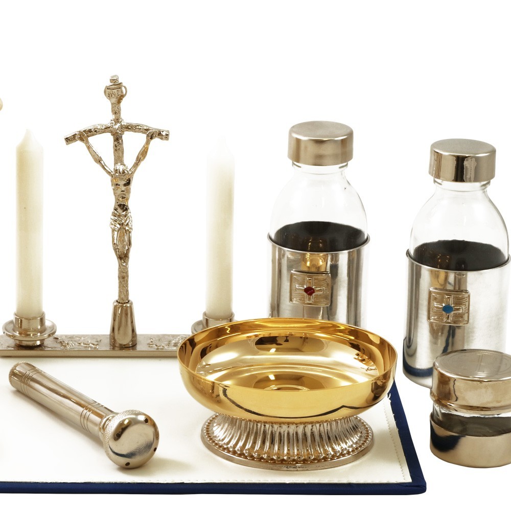 Viaticum case complete with brass pyx, cross and purifier. Size: 8x9 cm.