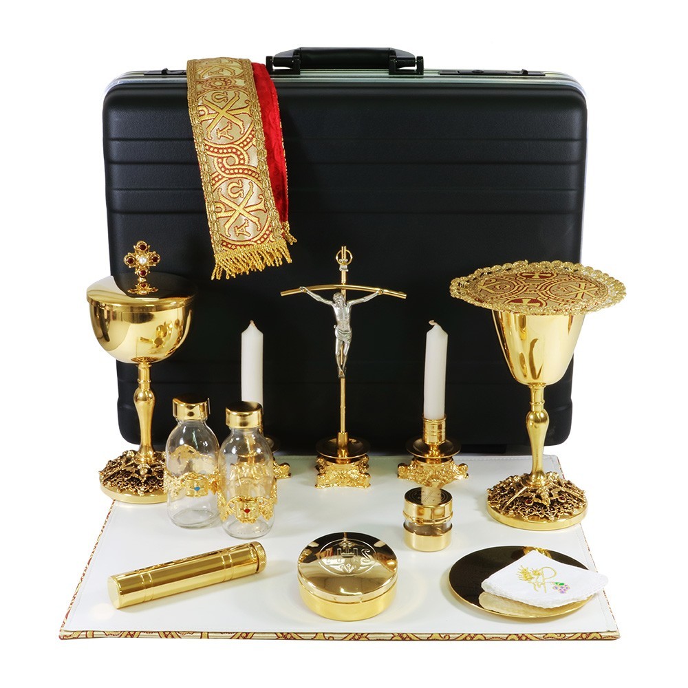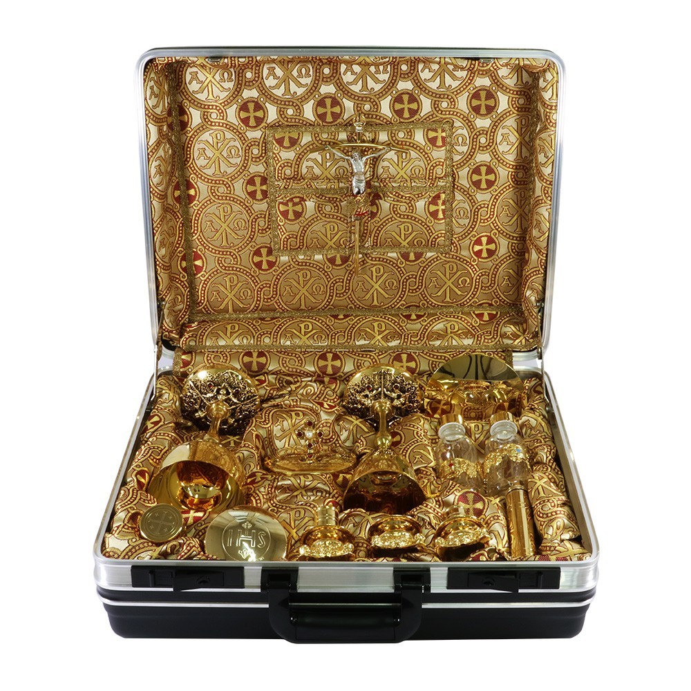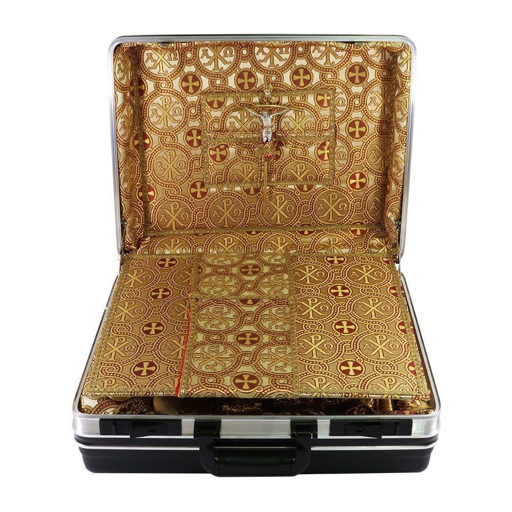 Viaticum case complete with brass pyx, cross and purifier. Size: 8x9 cm.