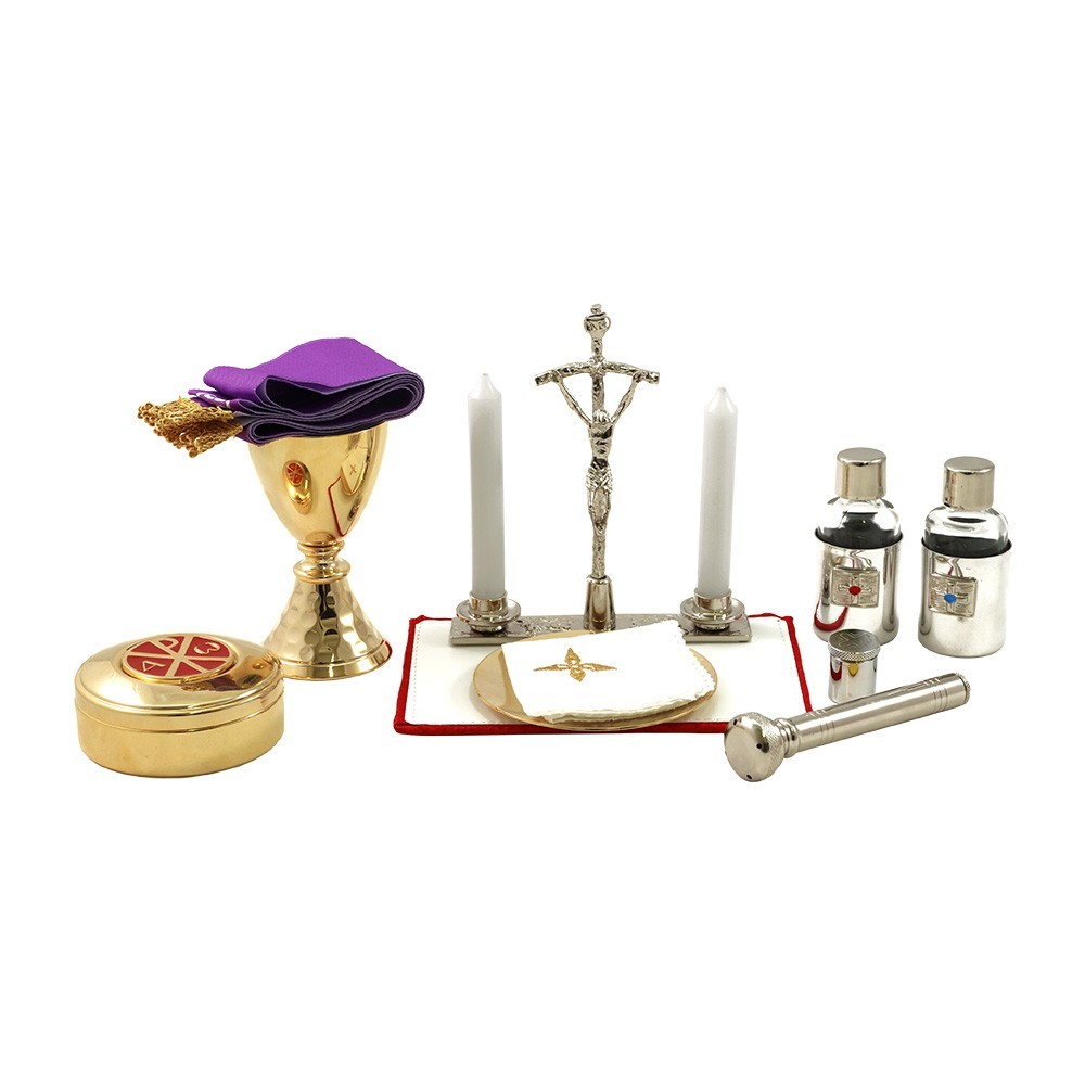 Viaticum case complete with brass pyx, cross and purifier. Size: 8x9 cm.