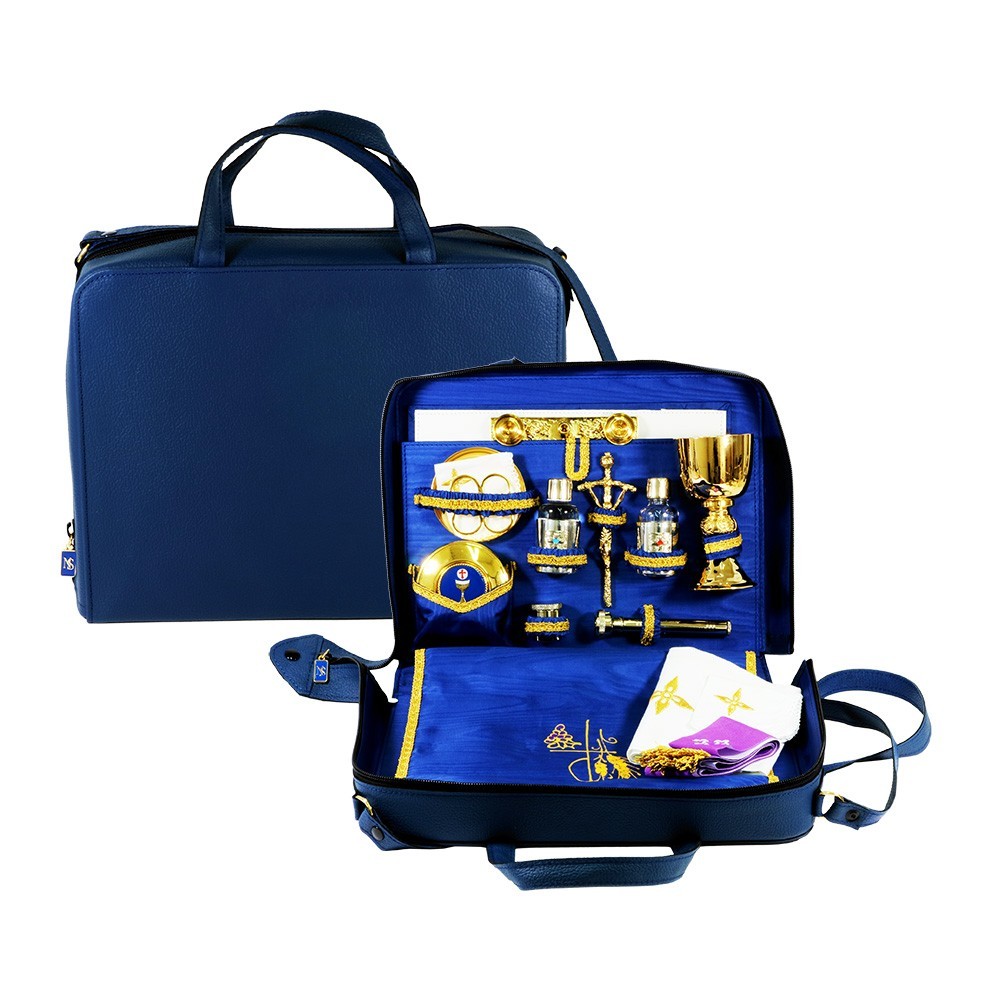 Mass kit shoulder bag in real leather with handles and inner blue moirè lining. Equipped with all the necessary for Mass celebration.