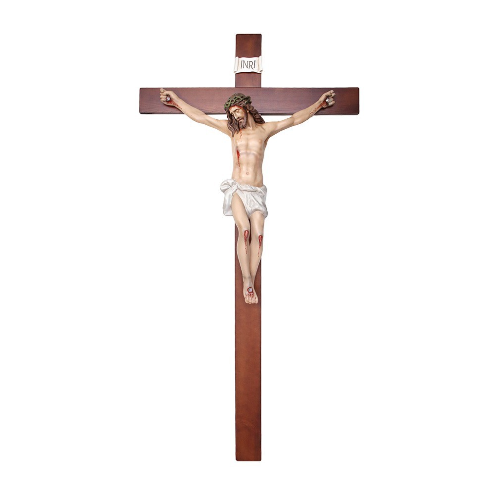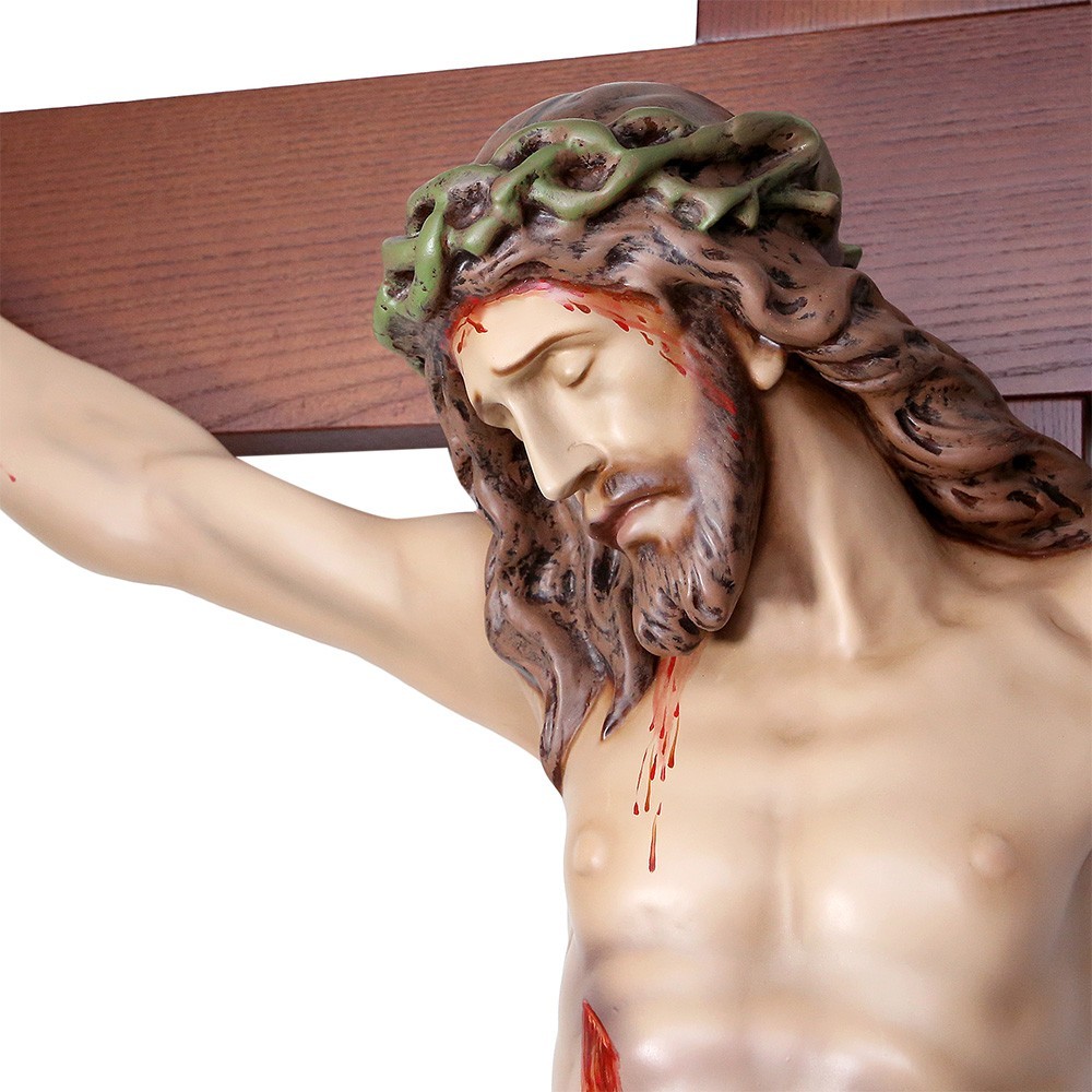 The cross is made of wood and the body of Christ is entirely made of fiberglass. Handpainted with acrylics and oil paints, which convey beauty to the statue.
