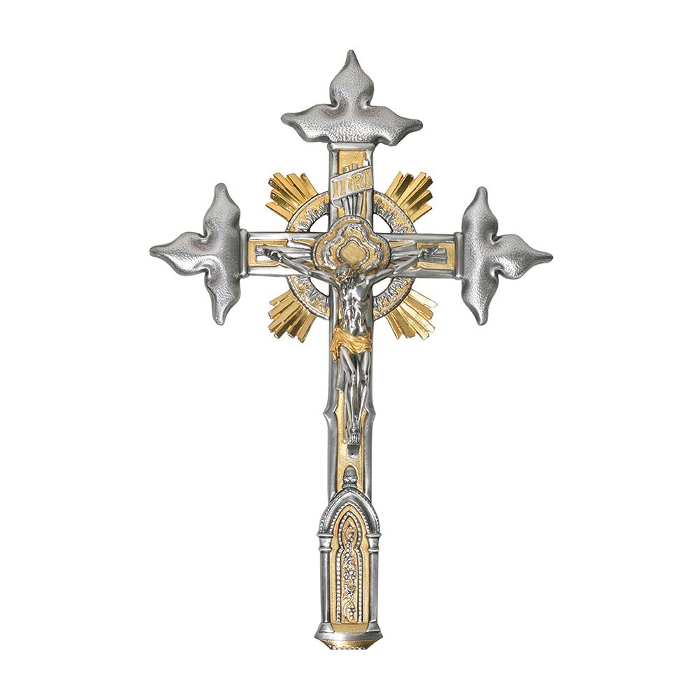 Wall cross made of brass with rays. Enriched on the edges with trefoil. This sacred furnishing is entirely made of two-tone brass with gold and silver finish.